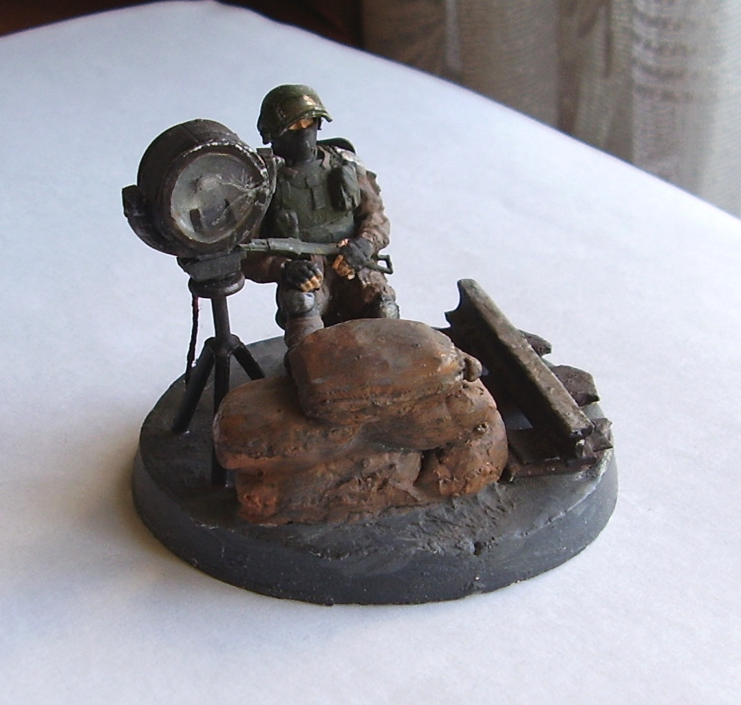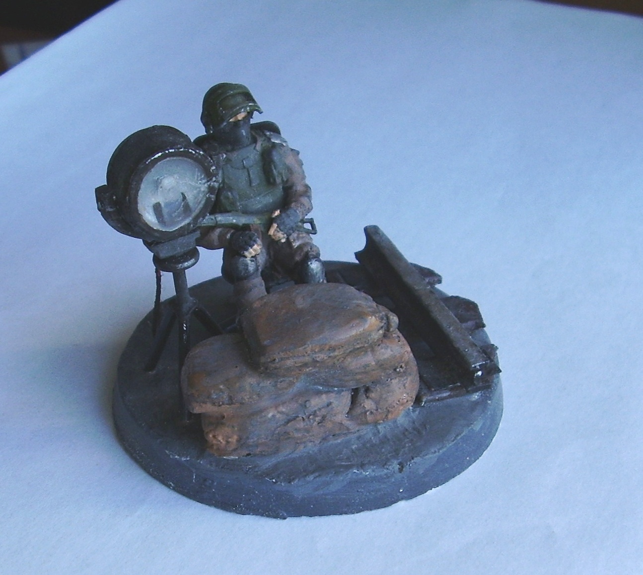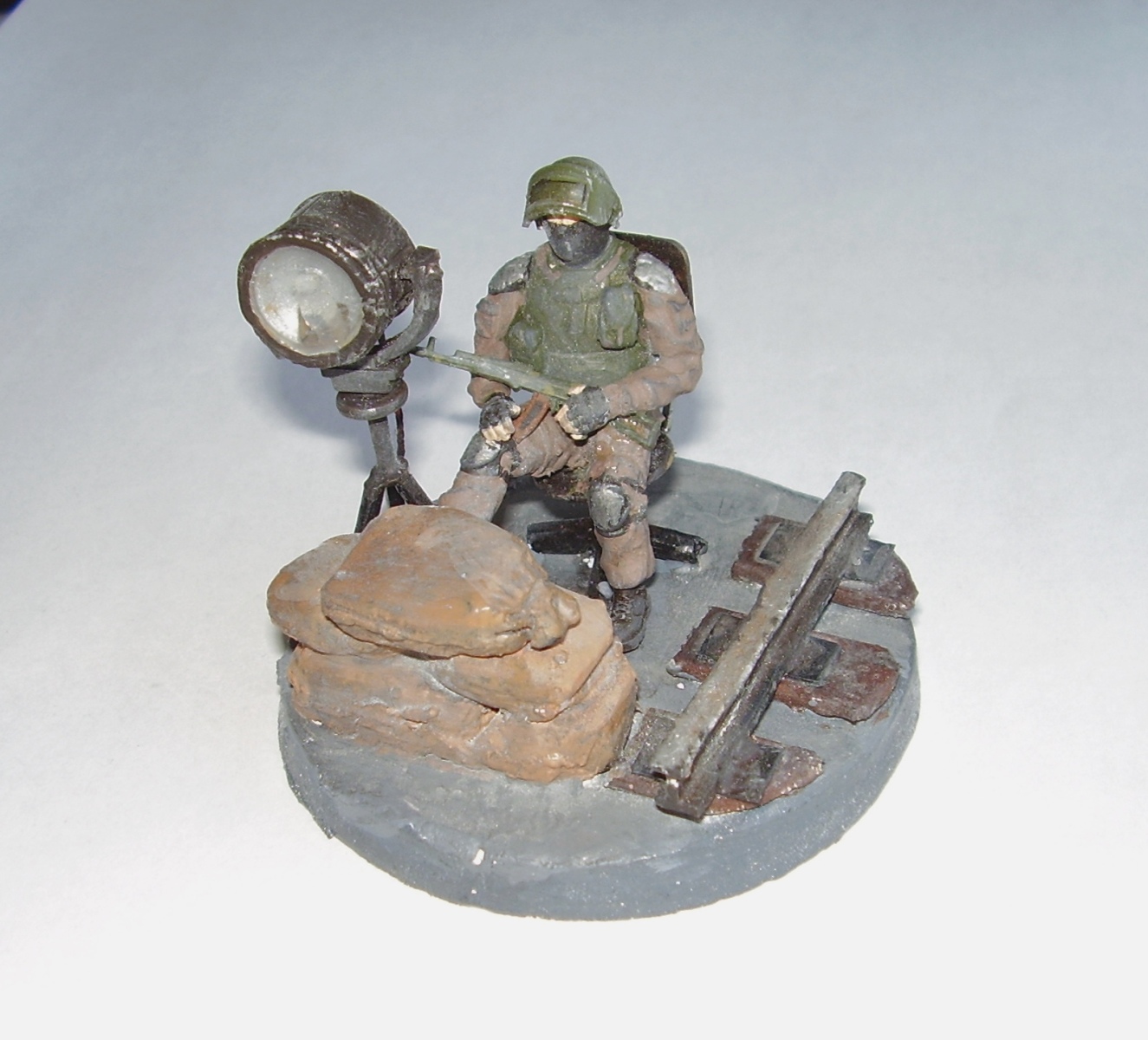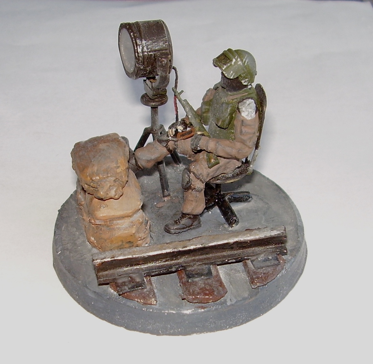 Прожектор, стул, рельса всё из остатков литника, что-то нагрел и вытянул, что-то сплющил потом обрезал. Еднственное это стело в прожекторе, прозрачный упаковочный пластик.