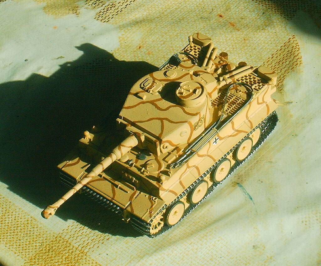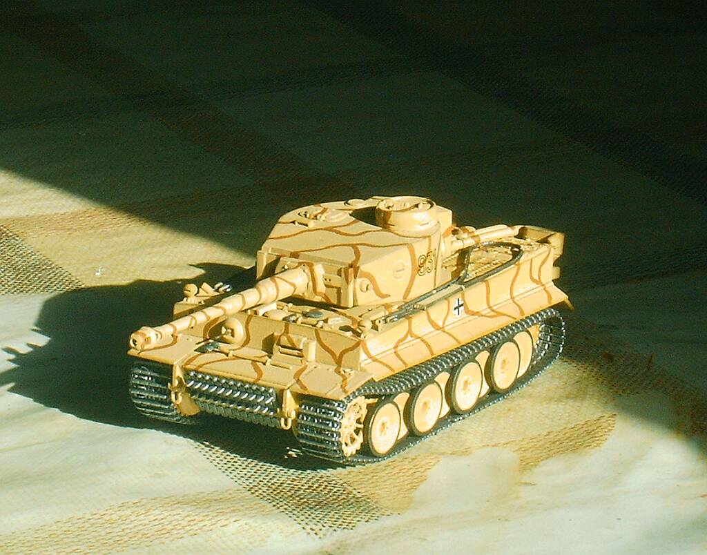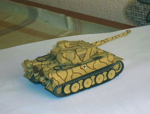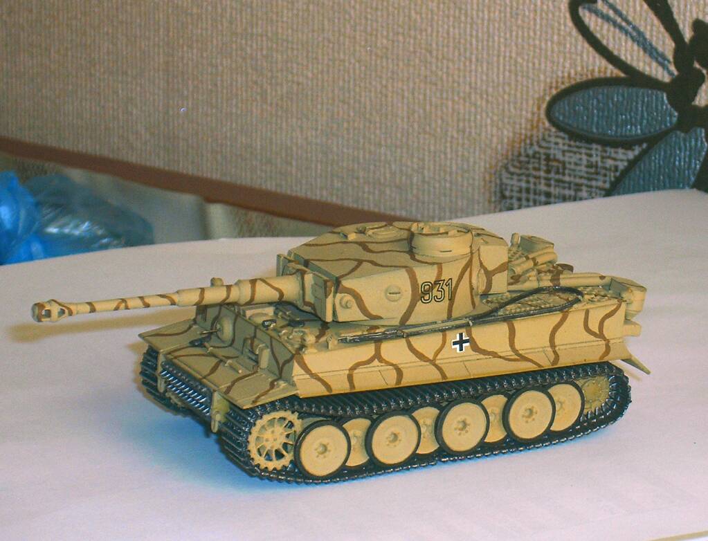 Я начинал собирать этого Тигра с великим тщанием, старательно прорезал смотровые щели, рассверлил гранатомёты и ствол орудия, срезал шпенёк заменявший курсовой пулемёт. В планах было изготовление тросов из проволоки и большой творческий эксперимент по обгадингу-запылингу. Дело дошло до окраски, вот тут то всё и началось. Во-первых, слой грунтовки получился толстоват и она заметно сгладила мелкий рельеф, потом, нанесённая сверху краска пошла трещинами. Это был большой облом. С великанского расстройства я засунул модель в коробку и спрятал- с глаз долой из сердца вон. Так бы и лежать ему в пыльном углу до скончания века, но судьба проявила к нему снисхождение, сведя меня с отцом моего друга. В разговоре выяснилось, что мужик собирает танки журнальной серии и очень сожалеет, что в ней нет немцев. И я решил подарить Тигра ему. Извлёк модель на свет Божий, покрасил кистью, акрилом "Звезды" прямо поверх растресканного слоя нитры. Слегка прошёлся по граням и швам простым карандашом. При нанесении декалей, совершенно сознательно, согрешил против истины- приклеил кресты, а то как же Тигр без крестов?