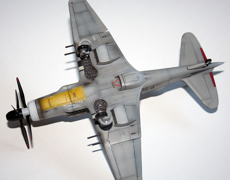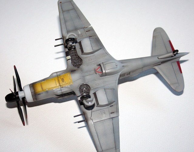 Кокпит восстанавливать не стал - прокрасил в цвет и подстарил. Немного подрисовал приборную панель. Высверлил стволы в орудиях, вырезал и вклеил под углом элероны, высверлил патрубки. Руководствуясь картинками из гайдбуков, накатал клепки, преимущественно на крыле. Вклеил имитацию шлангов на стойки. Щитки на стойках толстые - стачивать не стал, оставил как есть. Колеса заменил на Экипажевские, подобрал по диаметру, заднее - оставил из набора. Добавил БАНО.