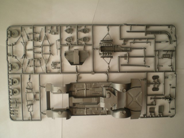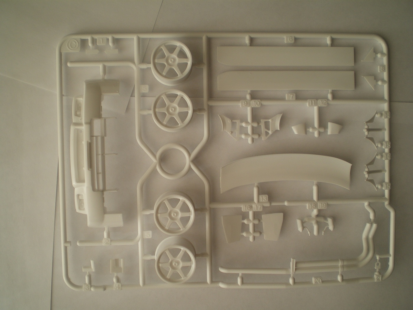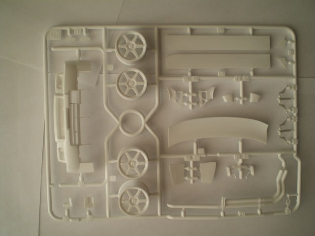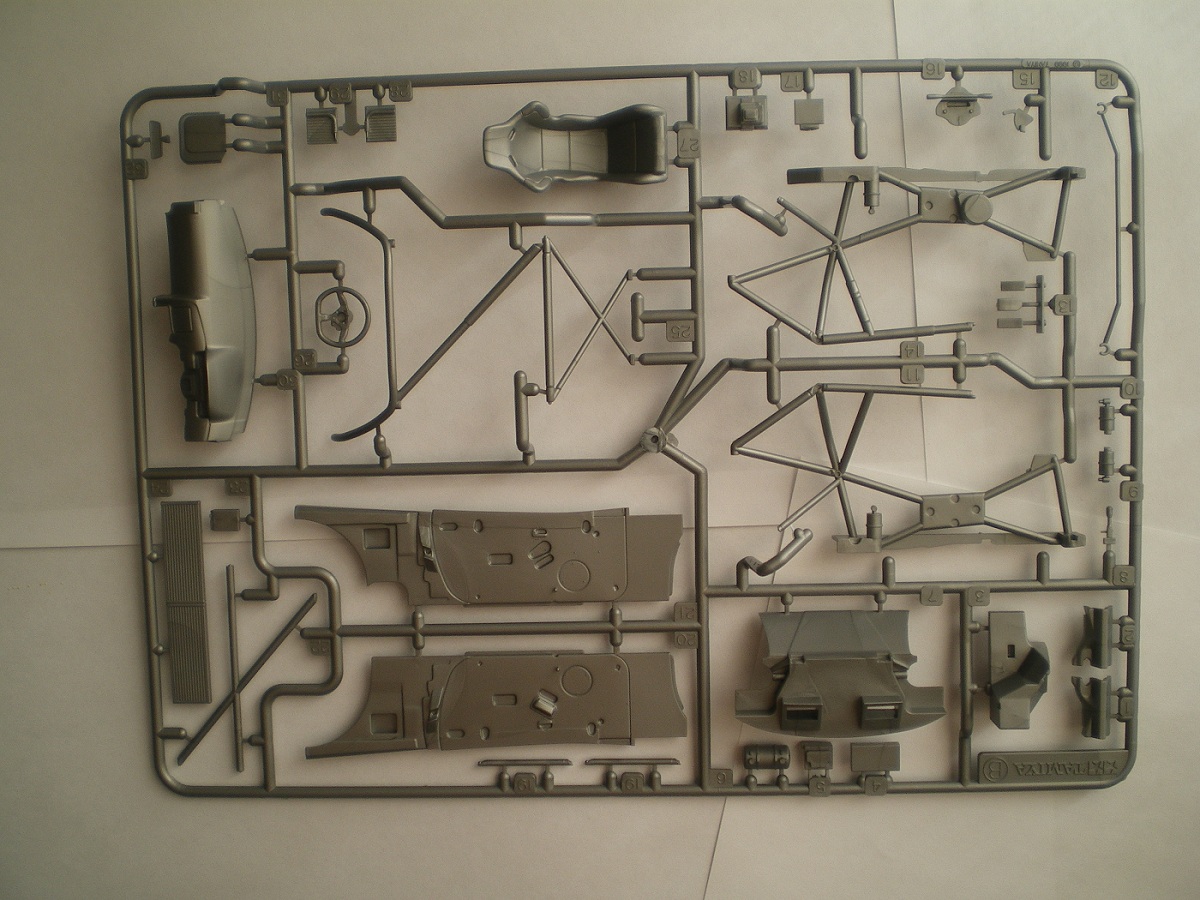 В комплекте 3 литника с кокпитом, подвеской, деталями кузова, 1 прозрачный литник со стеклами и защитой на днище, целиком кузов, 3 листа с декалями, 1 лист с масками, 4 шины хорошего уровня.