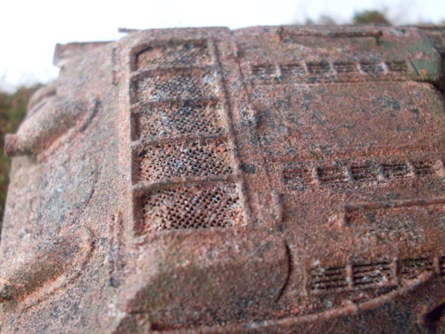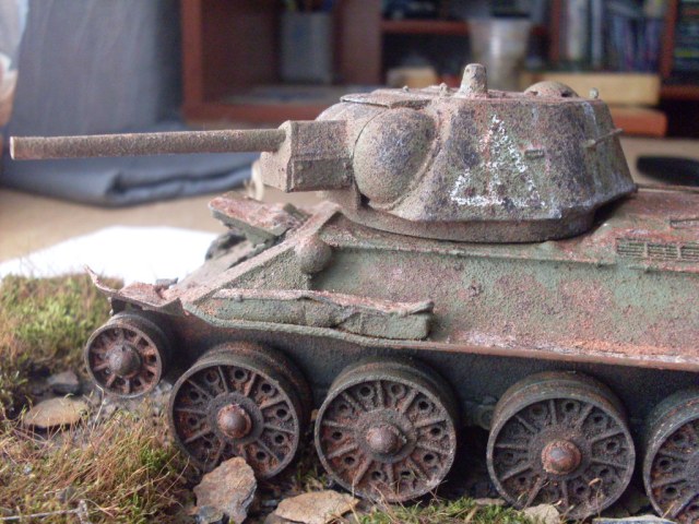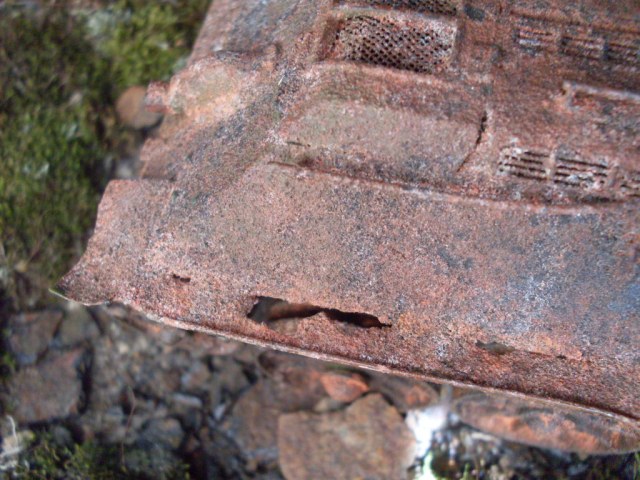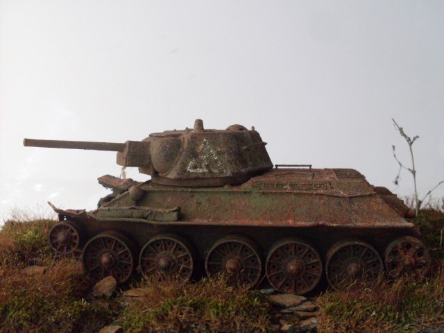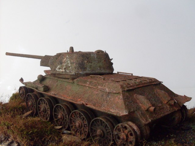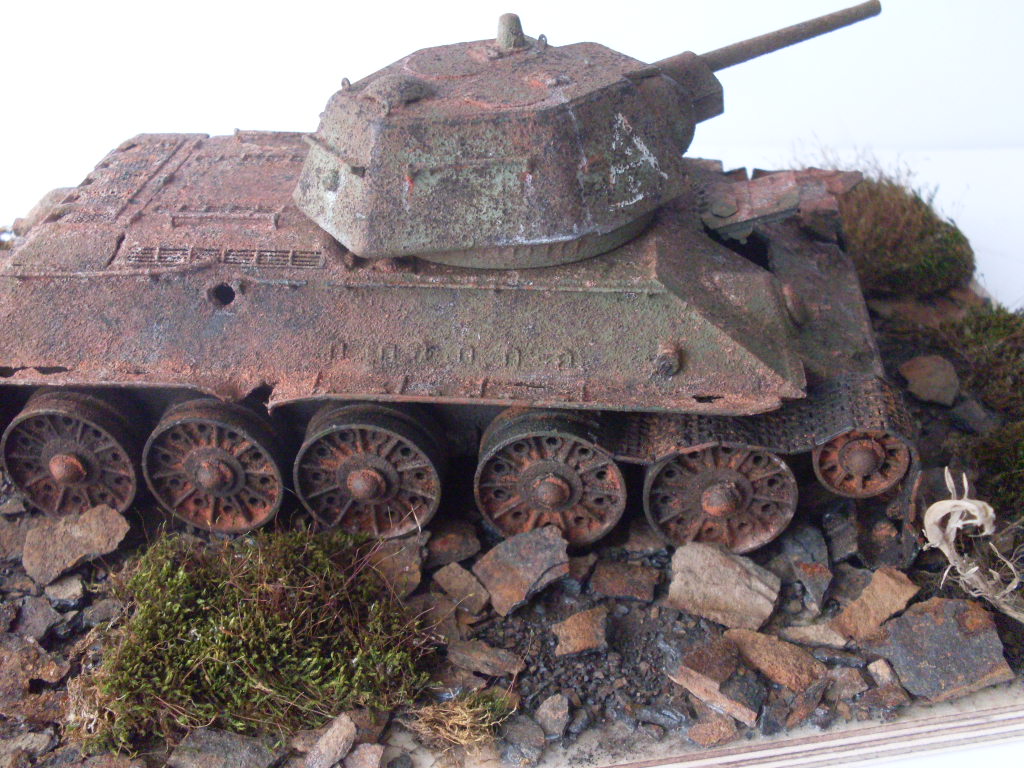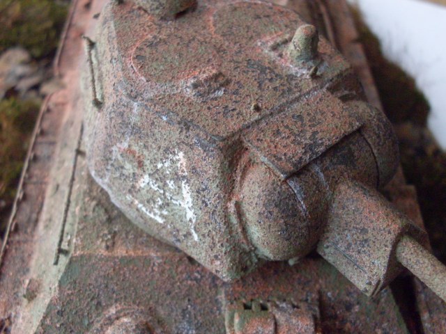 ...ТАК заржаветь танк не может!Уже ломали копья по этому поводу.Старая броня блестит,но ржавчины на неё почти нет,только если в фактуре.Почему я так утверждаю?У нас на территории караула лежали остатки Т-34,там борта,кусок погона...ещё что-то,ТАКОГО не видел.