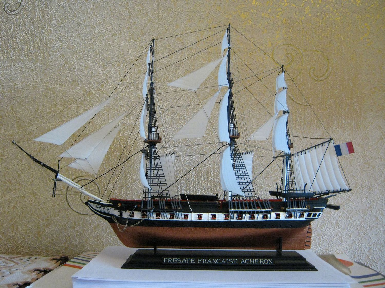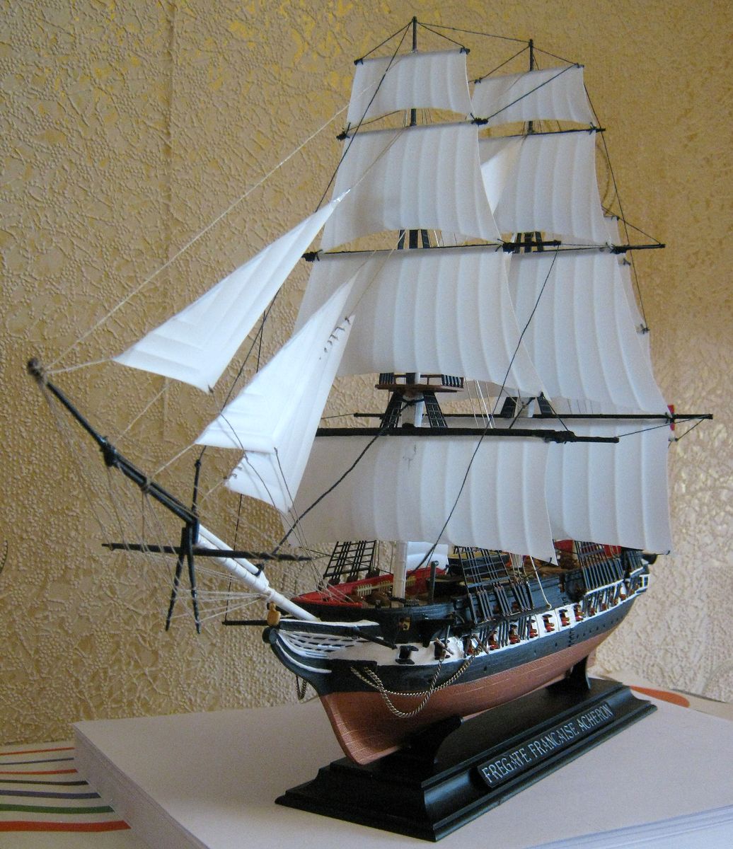Представляю на суд каропки свою вторую модель корабля - фрегат "Ашерон". Из собственных замечаний в процессе сборки: очень плохо сходиться корпус, не ставятся на свои места элементы пластикового такелажа, если мои собственные лишние нити портят корабль, то напишите. Но самый большой ляп - это паруса (параллельно палубе). Из покраски вызвала проблемы только белая полоса вдоль бортов, красил красками Звезды и Tamiya.
