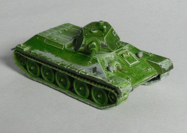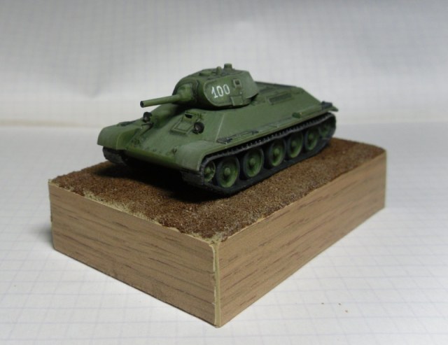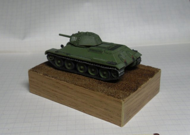 Узнал я что на НГ один родственник мне в подарок "тридцатьчетверку" приготовил! Зная ассортимент ( т. е. его отсутствие) наших магазинов, я с большой долей вероятности предположил, что это будет МОДЕЛИСТ Т-34-85 в 35-м масштабе. Как положено раскатал губу, начал думать о наборных траках, травлёнке, стволе...И тут, на тебе! Для настольных игр, полиэтиленовая (!), состоящая аж из 5-ти деталей, 60 мм в длину "модель" тридцатьчетверки . Я был слегка озадачен...Загрунтовал краской предназначенной для окраски лавсановой плёнки (белый цвет). На полиэтелене вроде держится. Проявочная покраска акрилом звезды. Доработки: курсовой пулемёт (проволока), смотровой прибор мехвода ( фольга), фары (обточенный рассверленный литник), рассверлены ствол орудия, выхлопные трубы. Краска - художественный акрил "Ладога" Возможно немного не попал в цвет, т.к. смешивал сиену,белила, сажу, окись хрома. При покраске траков добавил акриловой Звезды "сталь". После окраски основных цветов чёрной акварелью выделил углубления, немного высветлил большие плоскости и высупающие части. Кисточкой нанёс цифры на башню. Прошёлся по гусиницам "сталью" (акрил от Звезды). Задул матовым лаком супер-звезда. В углубления фар капнул глянцевый лак.