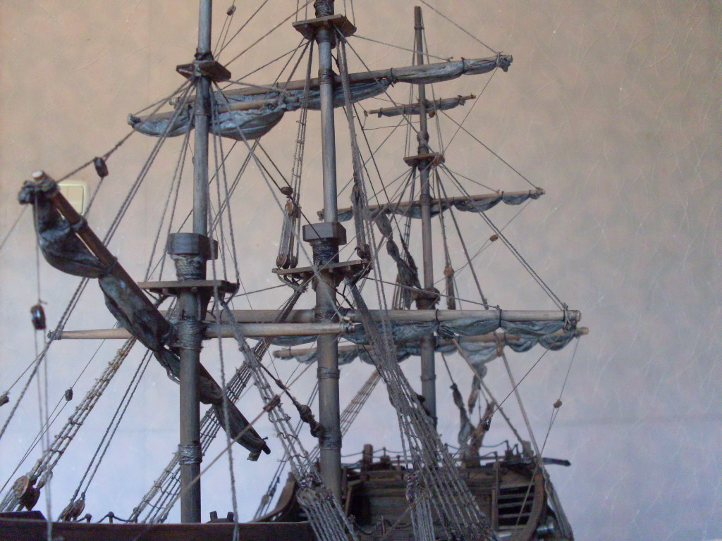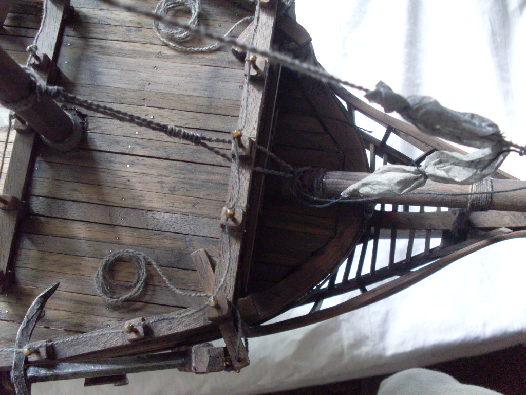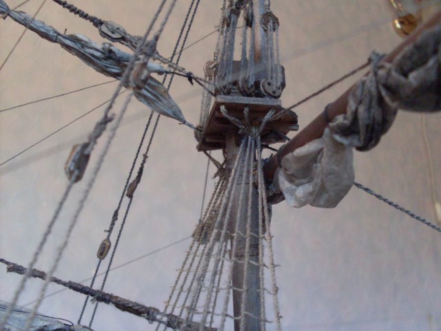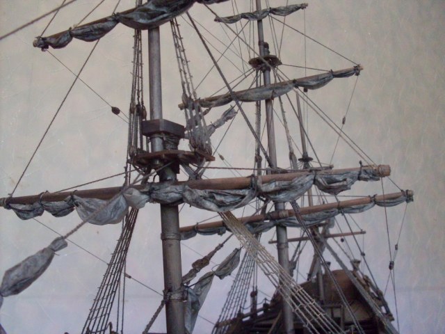 6) Такелаж кое-какой виден (помоему тока брасы, ванты и штаги), но не узрел куда он крепится, не увидел ни одной утки/кофель-нагеля и т.п, потом увидел, что брасы крепятся там же где начинаются. Для 1:350 масштаба я бы даже порадовался такой находке автора, но в метровой модели это плохо. Тали фор-стень-штага тоже обрываются на блоках и т.д.