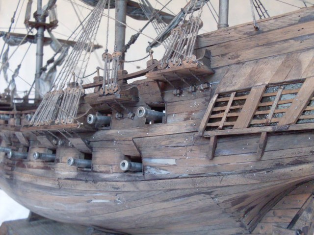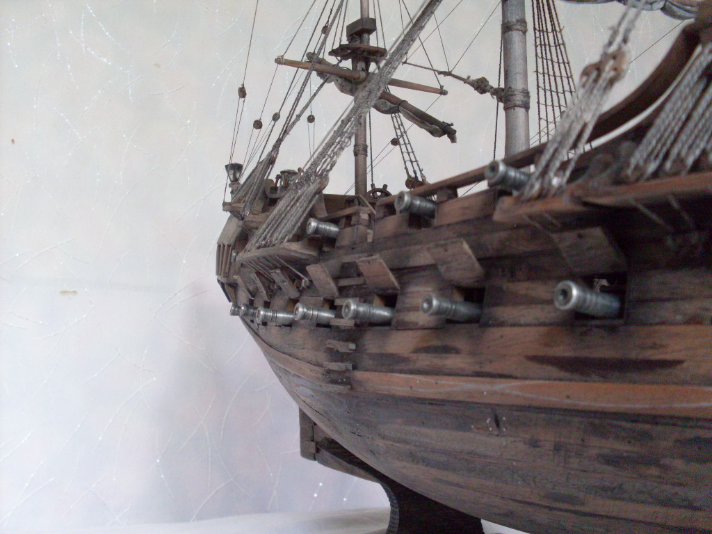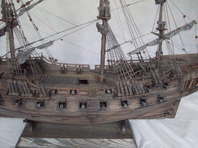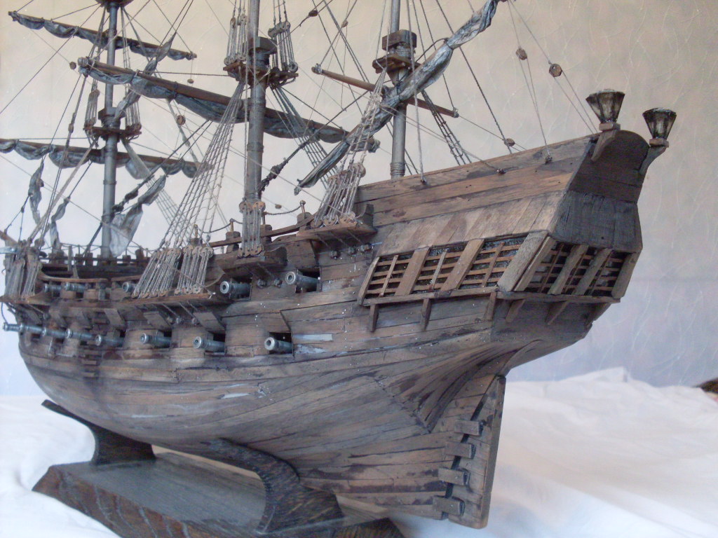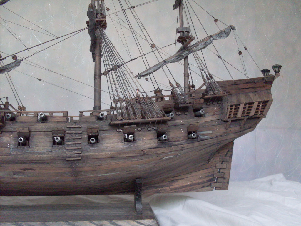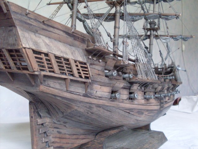 почему все решили что корабль должен быть одно цвета? фото в студию боевого корабля который не раз был в бою и на котором много заплаток, чо инет есть а фоток нет??? так вот есть тока музейные от которых до настоящих кораблей очень далеко. Корабли постоянно ремонтировались и уровень старения дерева был разный. По мне так большая часть придирок тут только из завести. Работа великолепная, летучий голландец, не раз бывавший в бою, старый с полностью облетевшими украшениями, и по непонятным загадочным причинам оставленный командой.