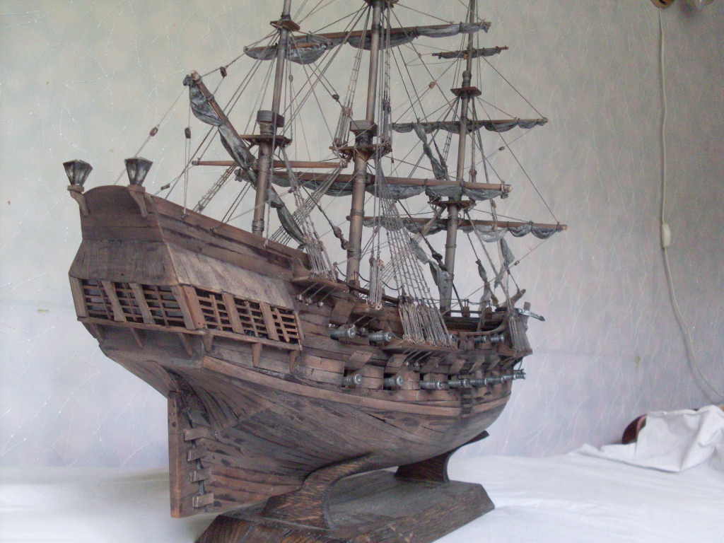Приветствую, уважаемые каропчане. Решил представить на всеобщее обозрение вот эту штуку. Масштаб указать не могу, но размер - да -955 мм от бушприта до кормы. Понимаю, модель не из пластмассы, но показать захотелось. За основу брал корабль "Черная жемчужина", но к детализации не стремился. Просто хотелось иметь парусник 17 века.