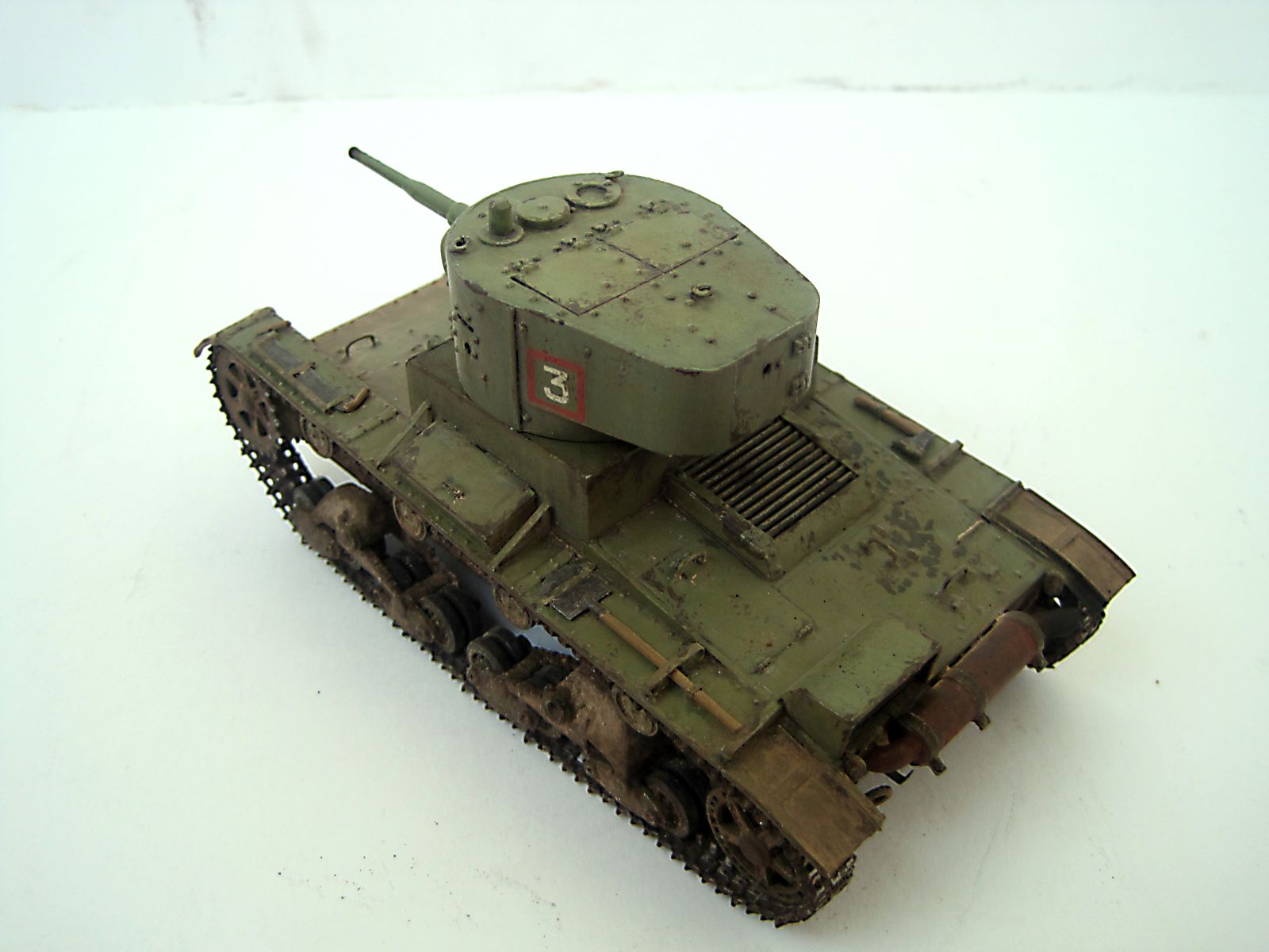 Доброго времени суток обитатели каропки! Представляю очередную свою модель - легкий танк Т-26. Машина известная, поэтому, я думаю, ликбез устраивать не надо. Сама модель была собрана несколько лет назад без всякой шпаклевки и прочих премудростей, покрашена какой-то зеленой автокраской из баллончика. Решив провести реинкарнацию модели, я очистил ее от краски, практически разобрал на запчасти и заново собрал, используя при этом большое количество шпаклевки, а также травление от "Эдуарда", гусеницы "Фриул", стволы от "RBМодел".
