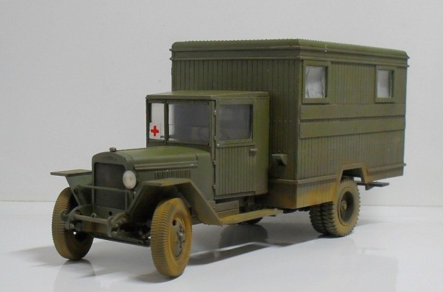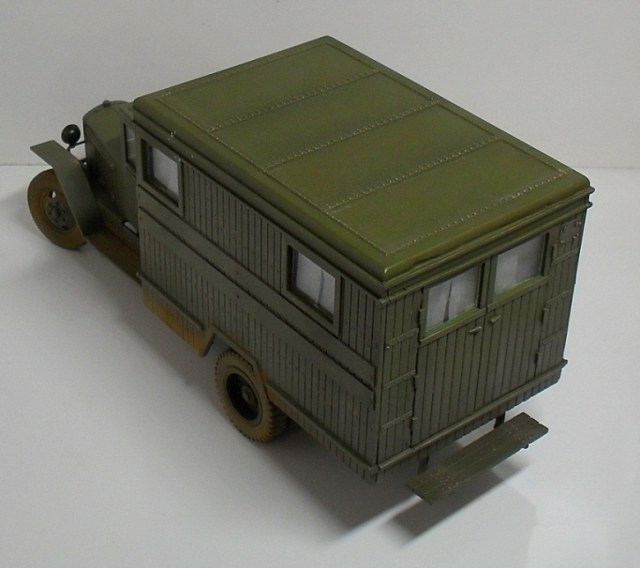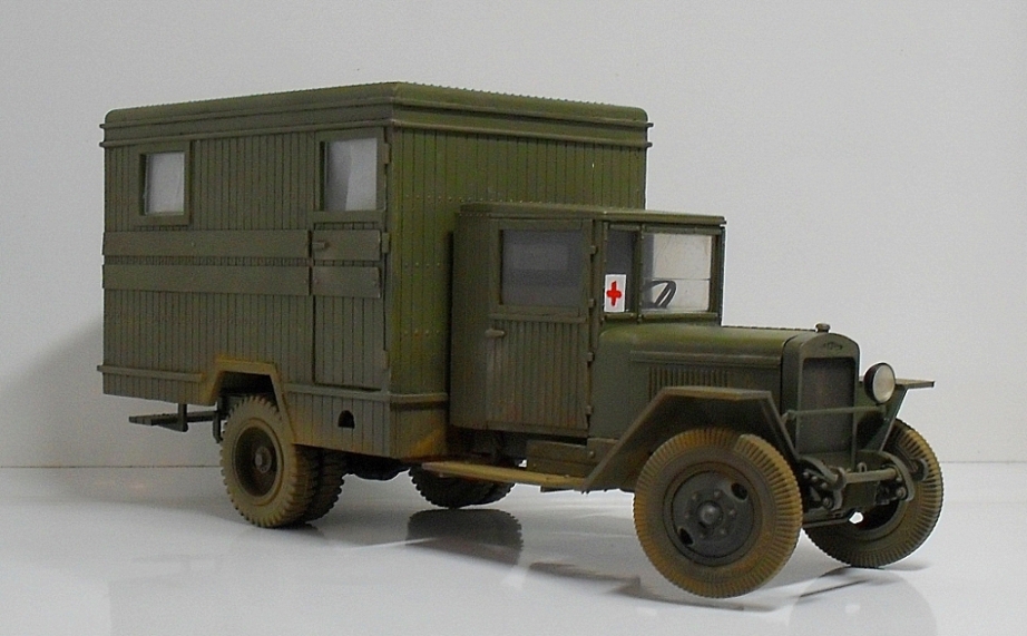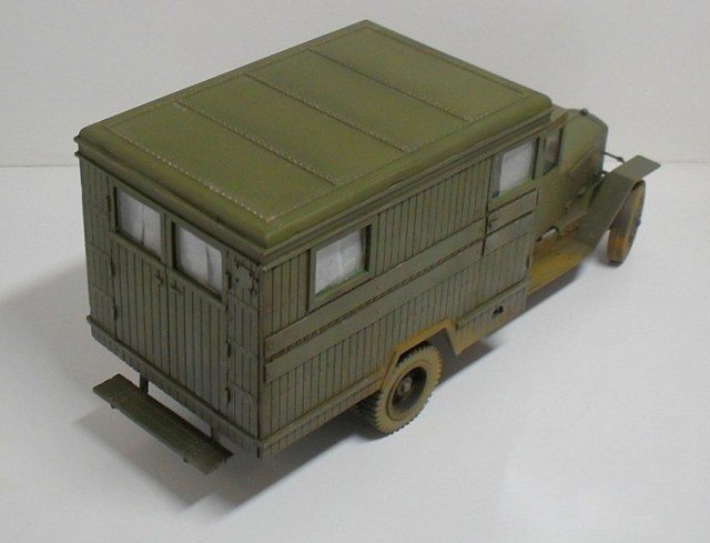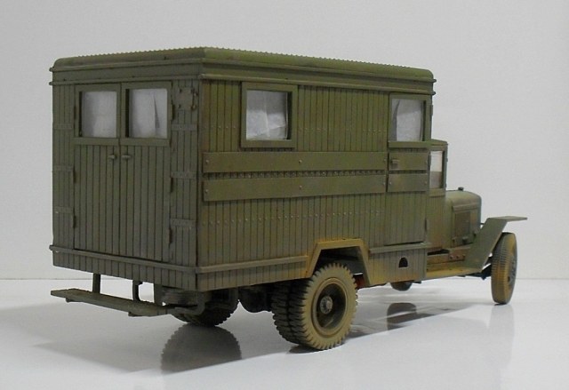 О прототипе: ЗИС-44 – санитарный автомобиль, выпускавшийся на базе ЗИС-5В. Вместо обычной грузовой площадки на шасси устанавливался деревянный кузов-фургон. Решение о создании такой машины было принято еще вскоре после начала Великой Отечественной войны, но организовать производство удалось лишь к середине 1942 года.