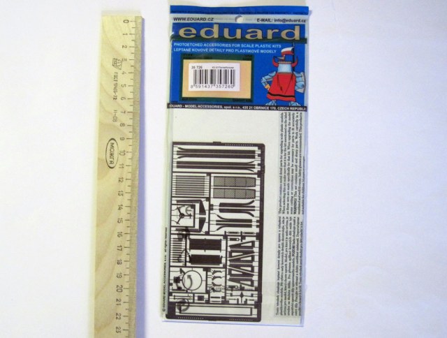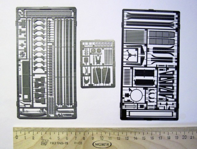 В стандартной, как я могу судить, для этой фирмы упаковке содержалось три платы фототравления и инструкция на двух листах формата А4. На платах фототравления идут элементы для решеток системы охлаждения танка, крепежа крыльев, перископы, шанцевый инструмент, детали для зенитного пулемета, крепления дополнительных топливных баков, заднего фонаря и еще много всякой мелочевки. Только крыльев не хватает для полного счастья. Как все это должно выглядеть на готовой модели можно посмотреть тут.