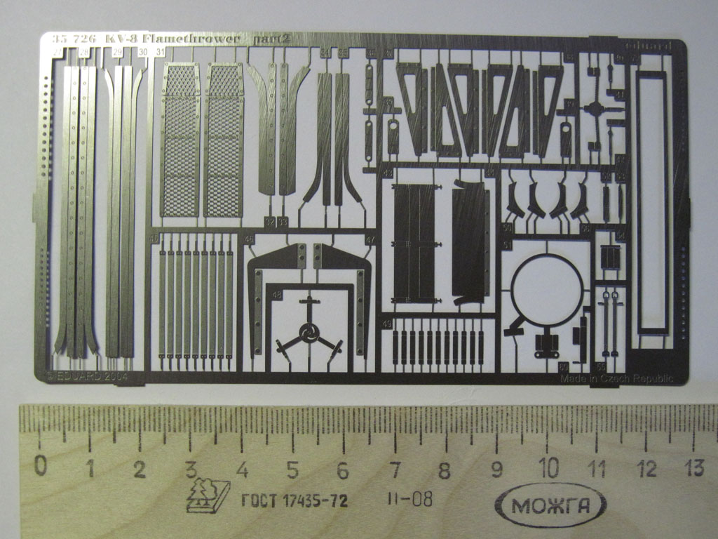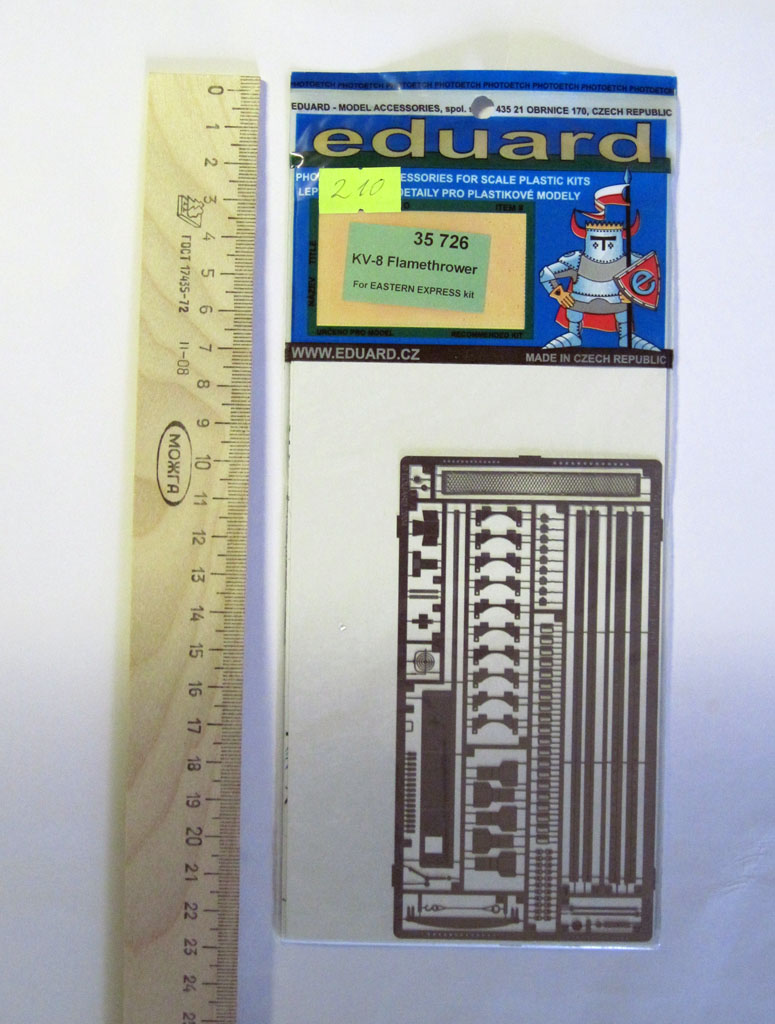 Доброе время суток, уважаемые каропчане. Бродя по интернет-магазинам я наткнулся на набор травления от фирмы "Eduard" для модели танка КВ-8 от Восточного Экспресса" за небольшую сумму, порядка 200 рублей с копейками. Поиск в Интернете обещал довольно богатый набор фототравления. Так оно и оказалось.