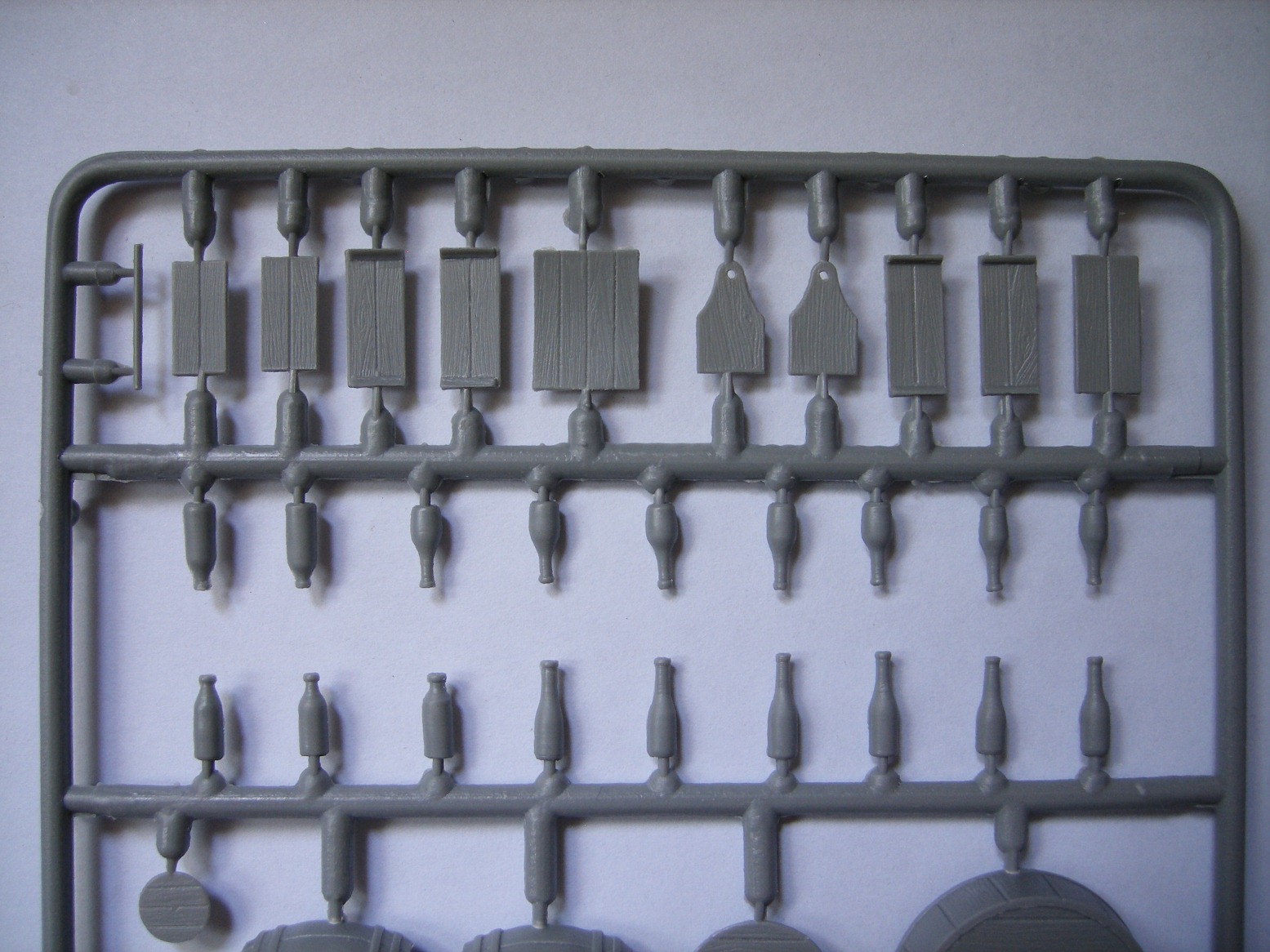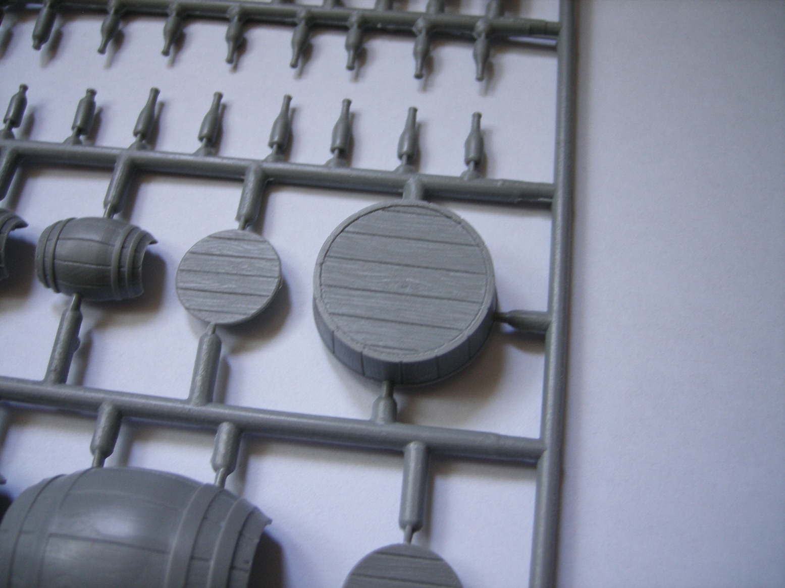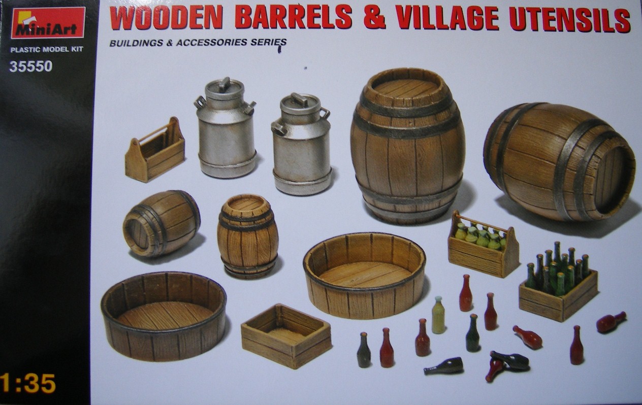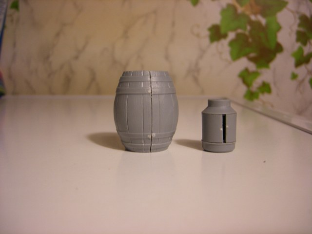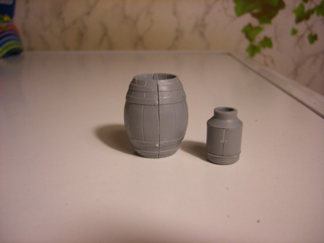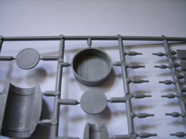 Реши представить вам обзор нового набора от МиниАрт приобретенный на днях. В коробке находятся два одинаковых литника, серого цвета. Тут же на скорую руку собрал одну бочку и частично бидон, что бы показать на фото качество отливок и стыкуемость деталей. То что получилось видно на фото. Особенно разочаровал бидон. Бутылки производитель мог бы изготовить и из прозрачного материала, из тех что в наборе получить прозрачные не получиться. Только под покраску.