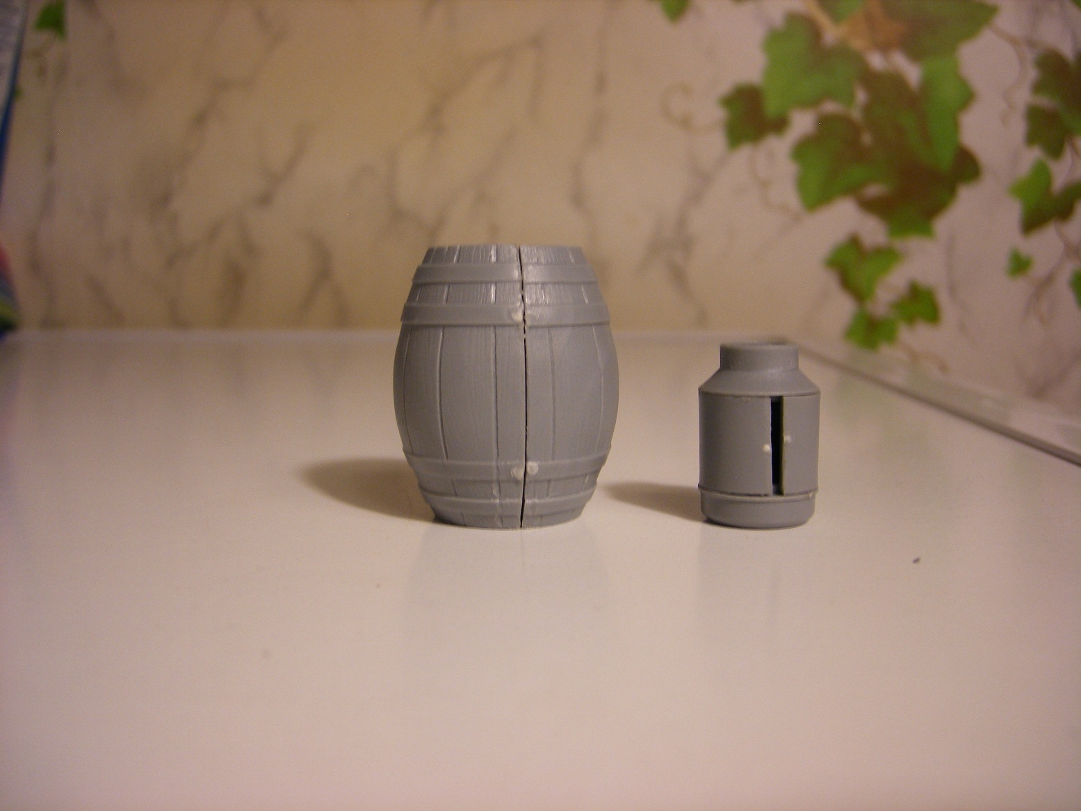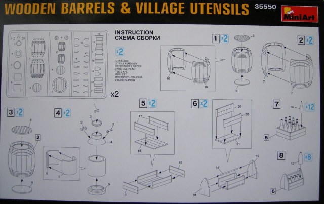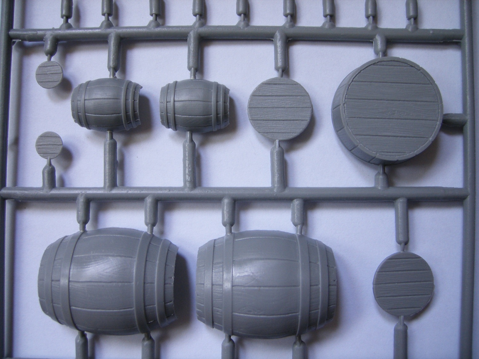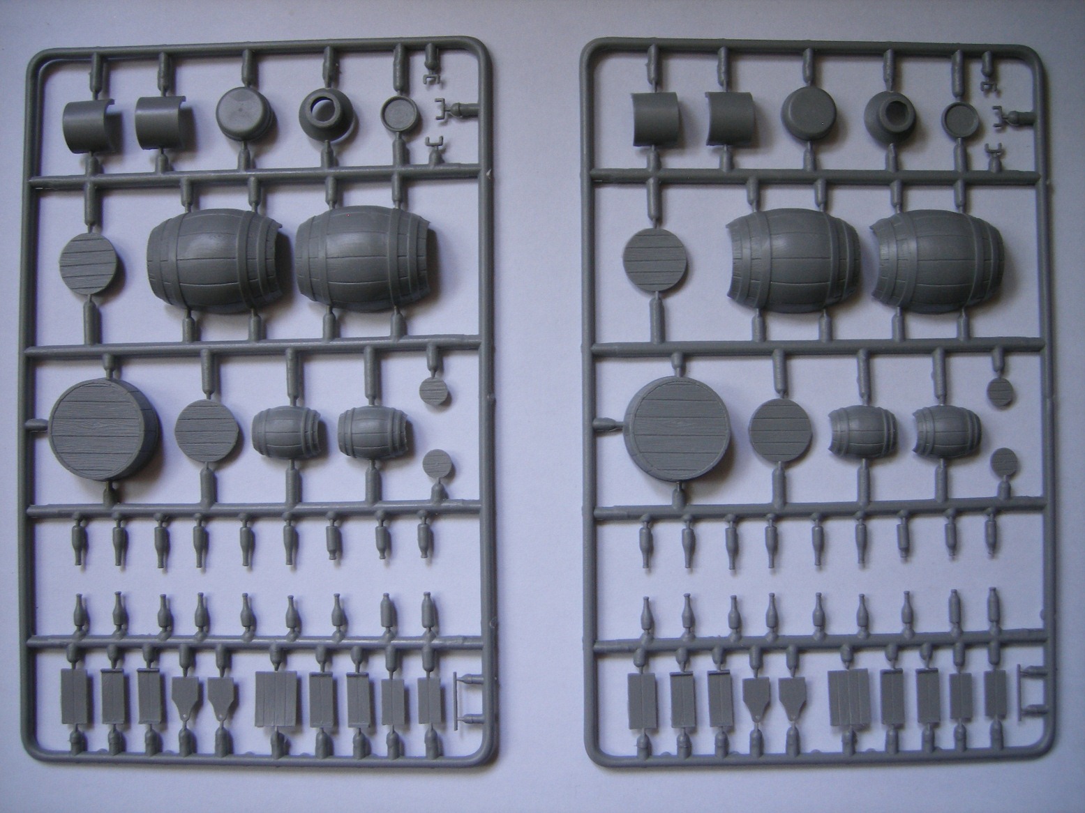 Реши представить вам обзор нового набора от МиниАрт приобретенный на днях. В коробке находятся два одинаковых литника, серого цвета. Тут же на скорую руку собрал одну бочку и частично бидон, что бы показать на фото качество отливок и стыкуемость деталей. То что получилось видно на фото. Особенно разочаровал бидон. Бутылки производитель мог бы изготовить и из прозрачного материала, из тех что в наборе получить прозрачные не получиться. Только под покраску.