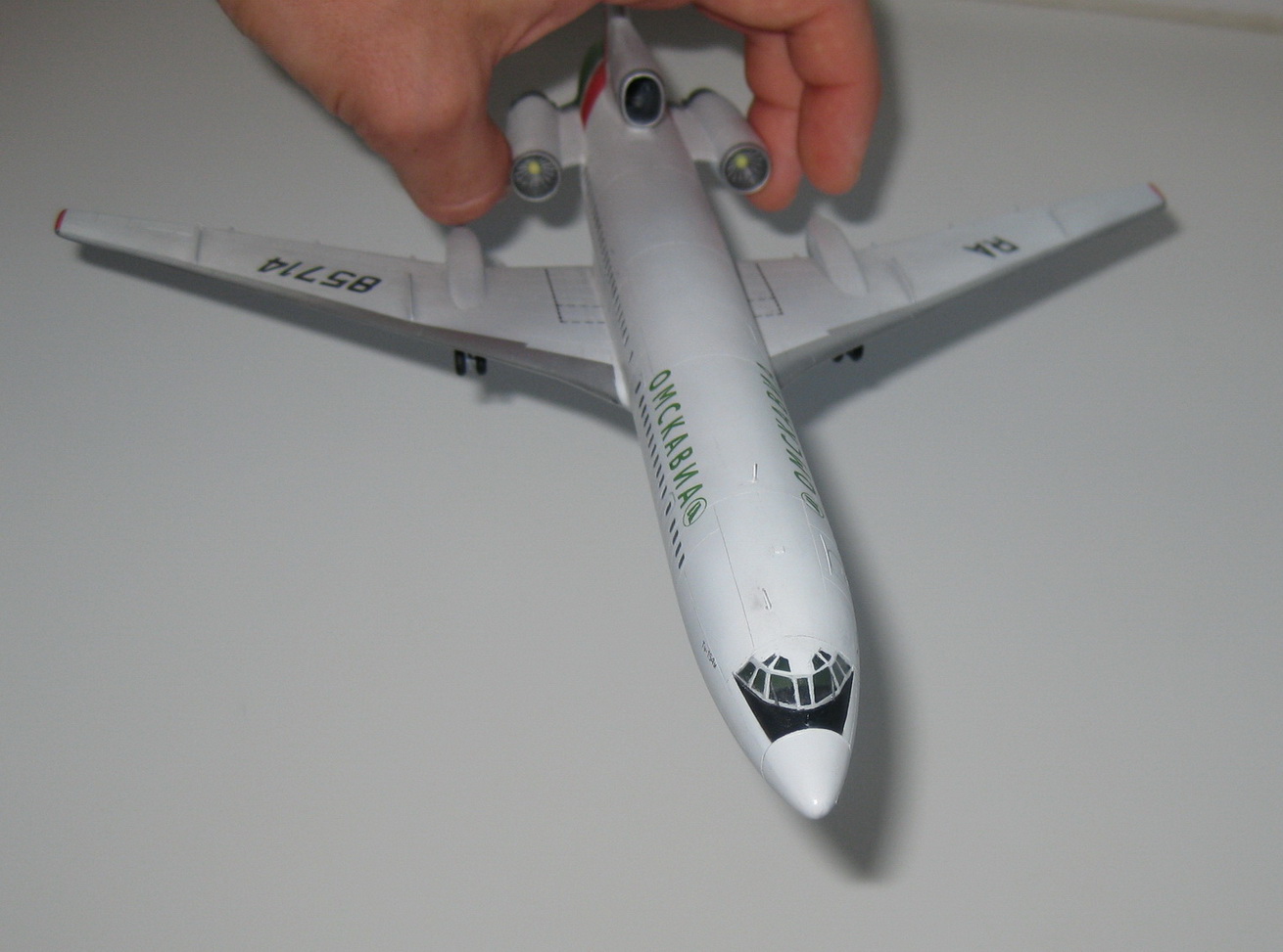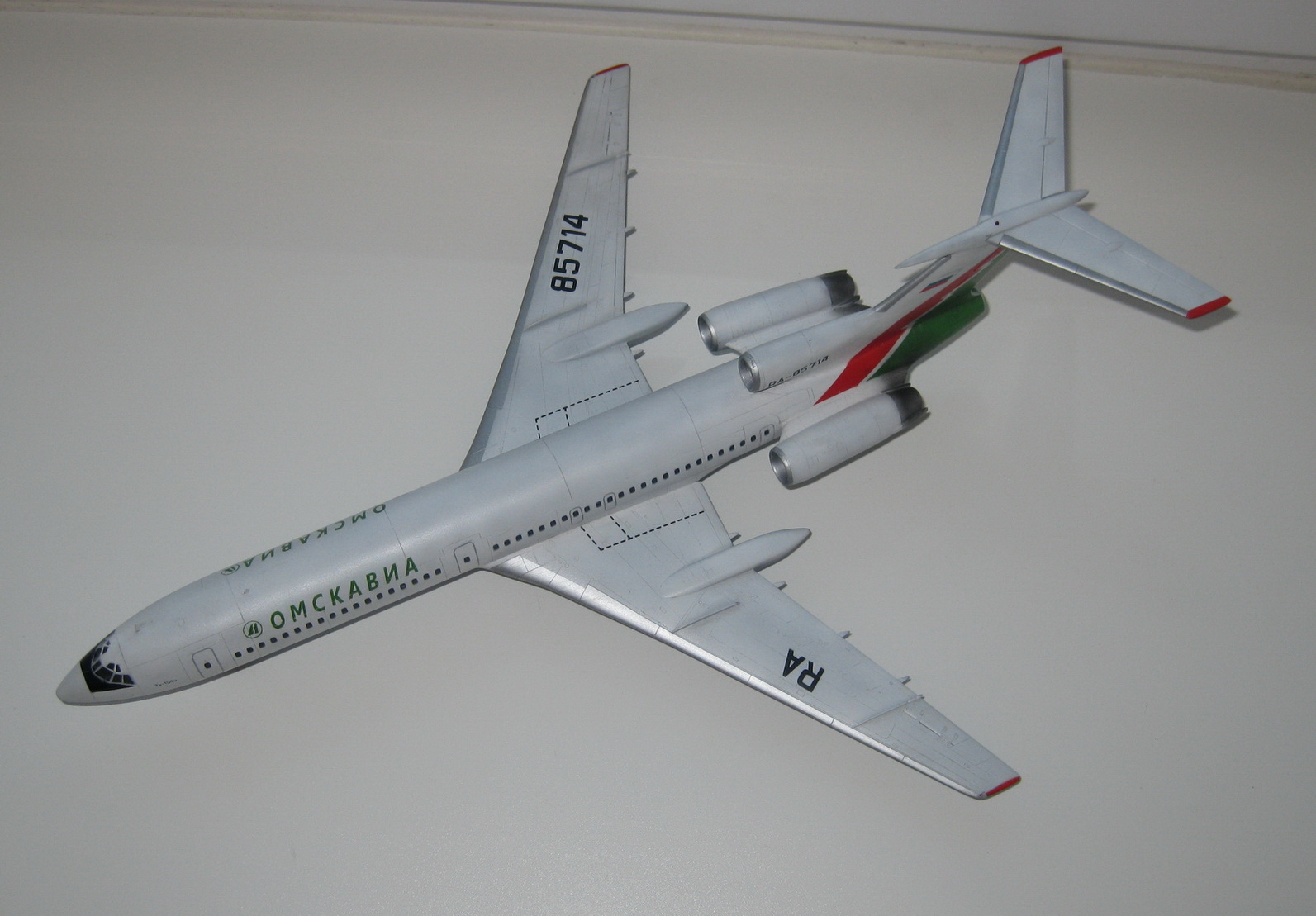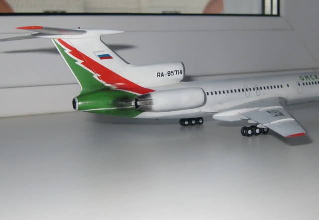 Модель сделана с незначительными доработками, без использования декалей вообще. Следы эксплуатации, на данной модели показал так, как я их себе представляю основываясь на фото. Старался добиться максимального сходства с ВС Ту-154м RA-85714.