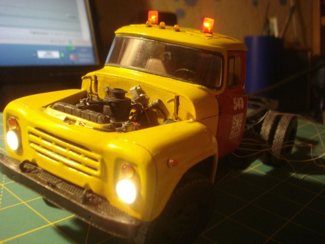 Картонная модель автомобиля Зил ,собранная из журнала WMC в 25м масштабе. В журнале даны два варианта машины.Бортовая и "аварийка". Автомобиль собирался в рамках конкурса на сайте издательства.Внесено много своих доработок с целью придания большей реалистичности.В модель встроена простейшая электросхема.Подсвечиваются фары,стопы и мигалки на крыше.Открываются двери,капот,снимается будка.Передние колеса поворотные. Модель окрашена автоэмалью.Следы эксплуатации акрил.