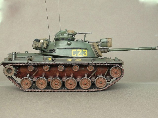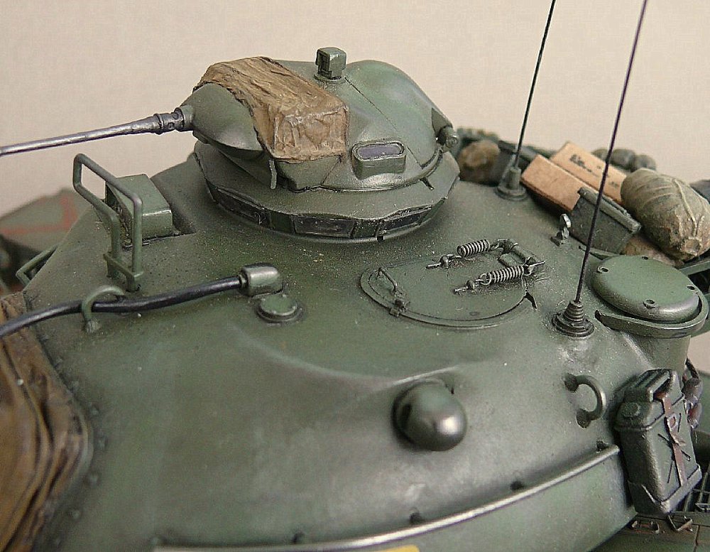 Представляю уважаемым каропчанам на суд свою двадцатую- юбилейную работу,на этот образец американского танкопрома. Полегенде танк принадлежит частям морской пехоты,высадившимся в Дананге весной 1965 г. Довольно приятная в сборке модель,хотя литники и датируются восьмидесятыми годами. Из доработок: Передние крылья из жести,иммитация пружин налюке заряжающего,полностью сделаны из ДВД все триплексы,иммитащия брезента на маске пушки и пулемета,ограждение фар из жести,антены из волосков от кисти,обвес из коробки и смола Kondor. Окраска Акан,смывка акрил на фейри,пигменты от Мастер-Пигмент. Вроде все. Спасибо за внимание.
