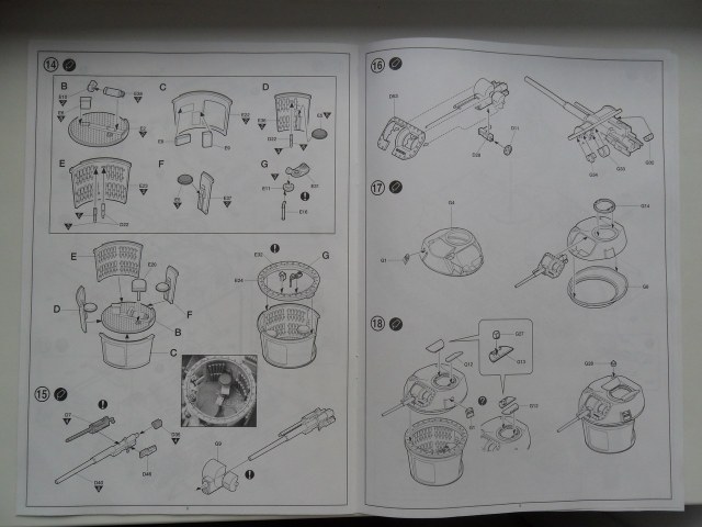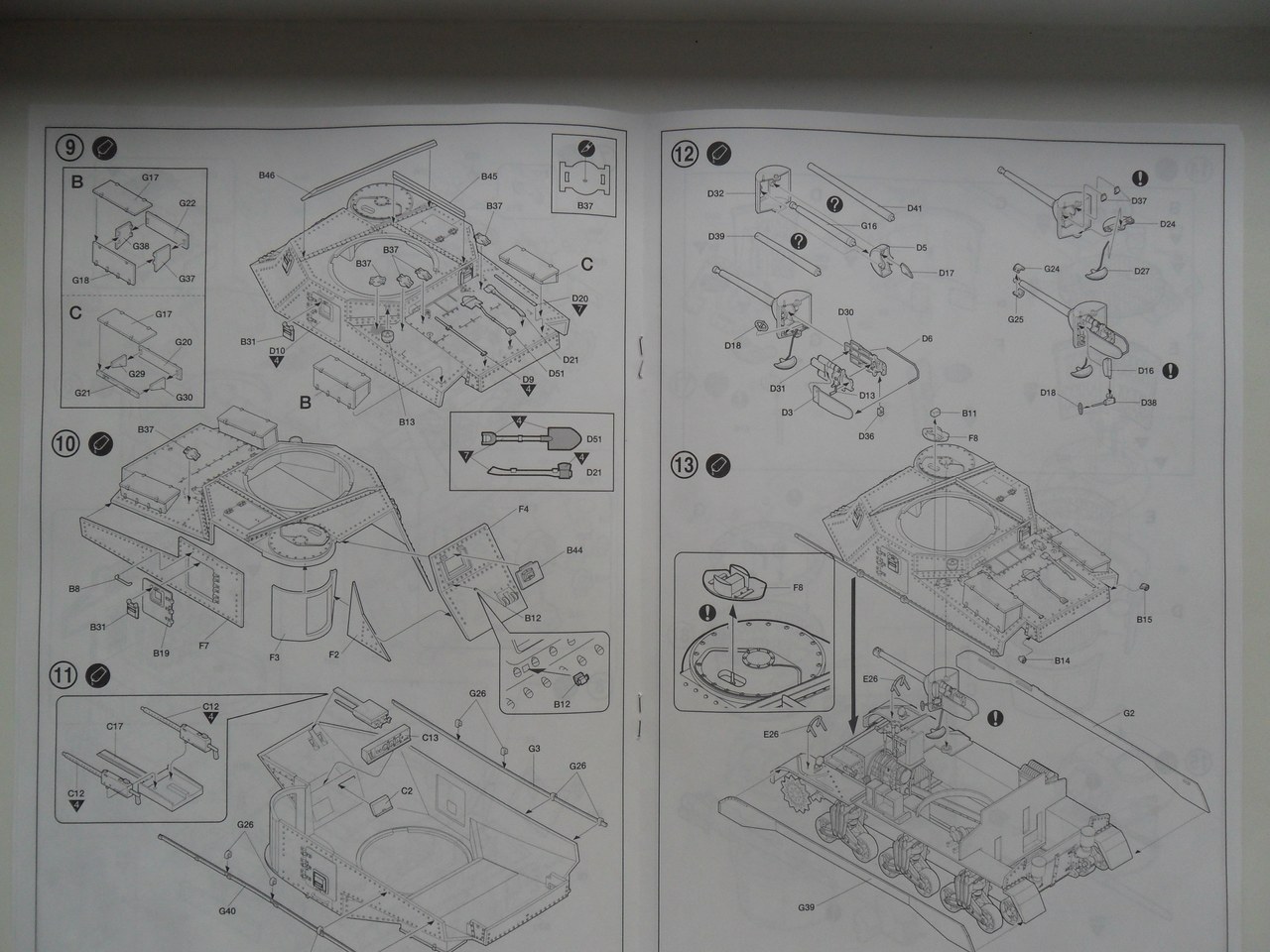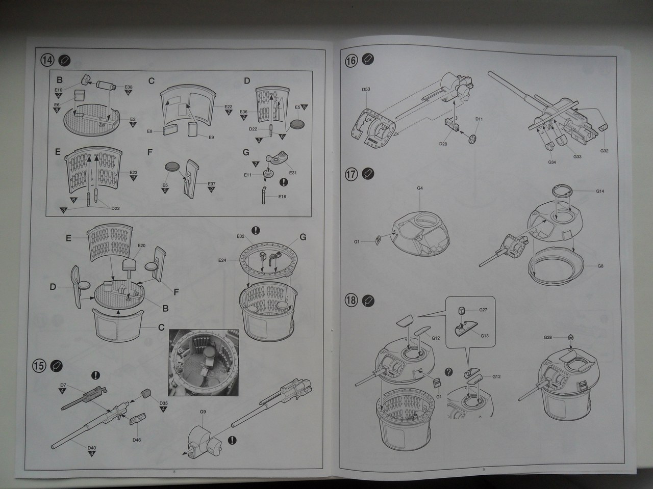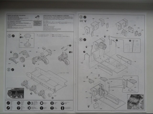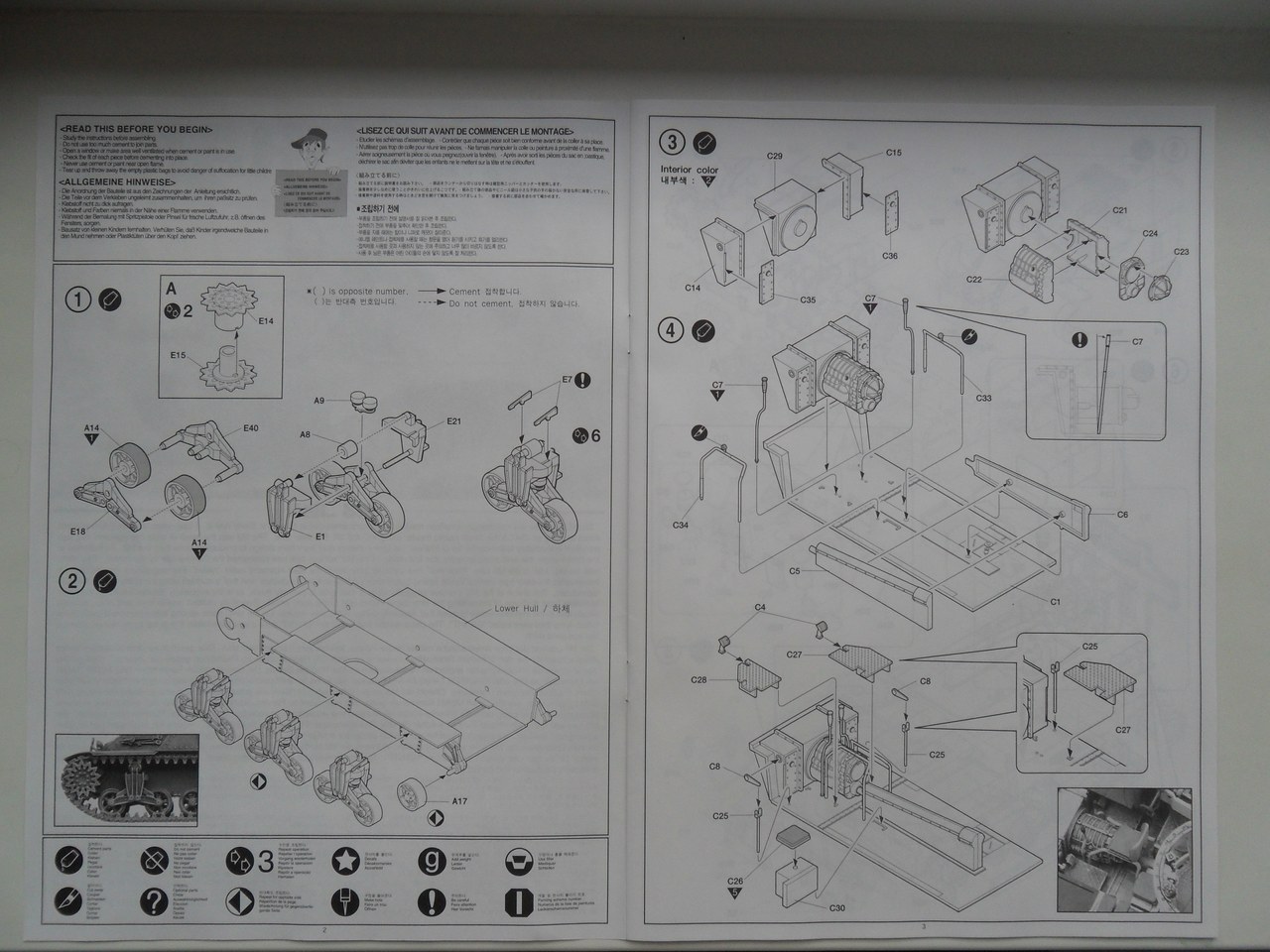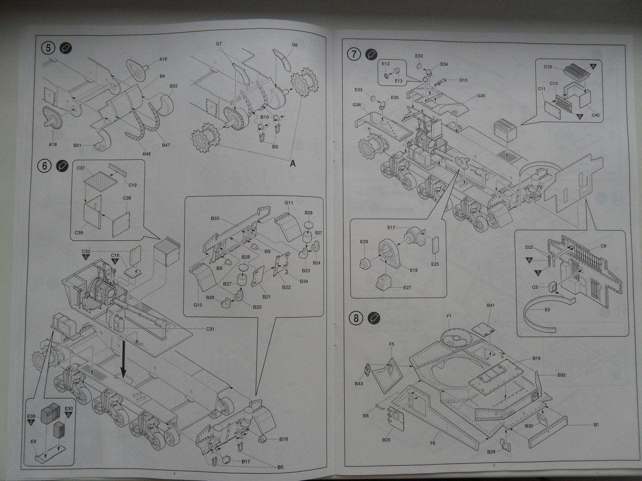 ...Открыв коробку,я обнаружил хорошо уложенные литники,каждый в отдельном пакетике,количеством 8(!)штук,ванную корпуса отдельно,декали на 2 варианта окраски и жёлтый листочек на языке,который не знаю,типа "Варнинг",но не английский,там было полно иероглифов.Также есть инструкция на 20(!)страницах,на первый взгляд,вроде понятная,но перевода не обнаружил,буду упражняться в английском,чтобы не забывать.