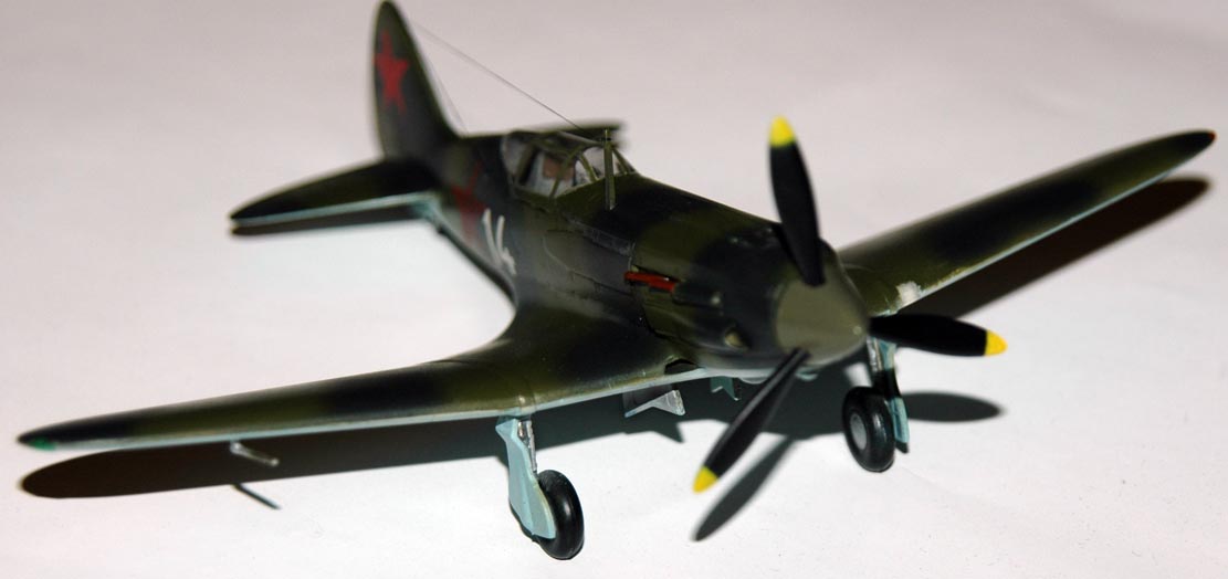 В наборе от Hobby Boss лежит вполне симпатичная модель Мига, на сегодняшний день это лучшая модель Миг-3 в 72 масштабе. Но и у неё есть пороки, которые необходимо было устранить. Ну, вопервых, отсутсвие приборной доски и ручки управления решается довольно просто, делаем заново - и все. Вовторых, необходимо было просверлить кожухи выхлопных патрубков и проточить каналы пулеметов. Пару передних труб выхлопных патрубков добавил, сделав из металлических трубок. Т.к. этот Миг поздних серий, то покрышкинский пятый номер, который дается в наборе к нему просто не подходит. Я сделал Миг из состава ПВО Ленинграда 1942 г. по фотографиям. Красил Тамиевской эмалью.