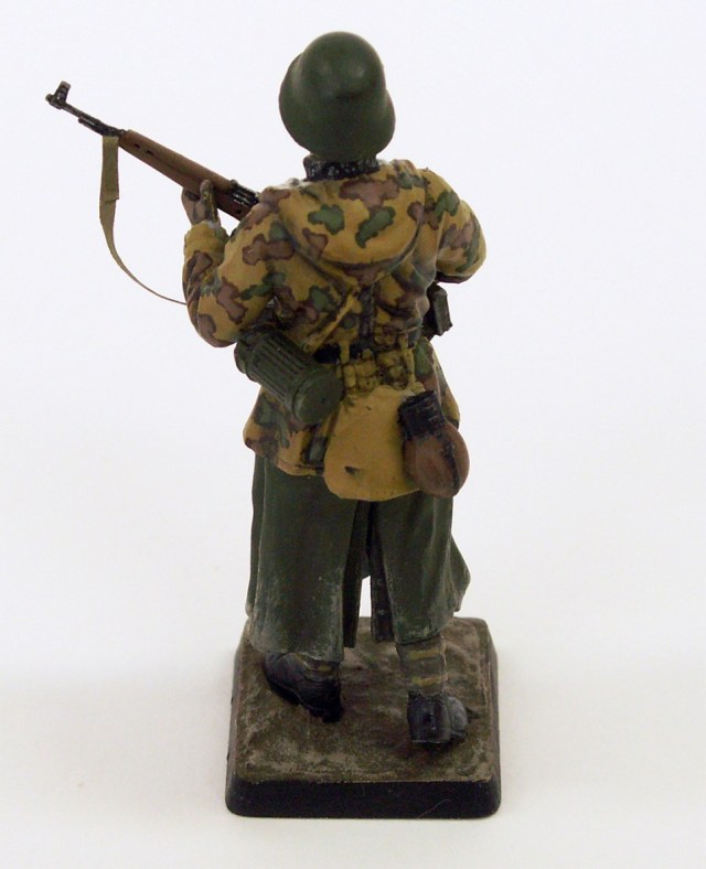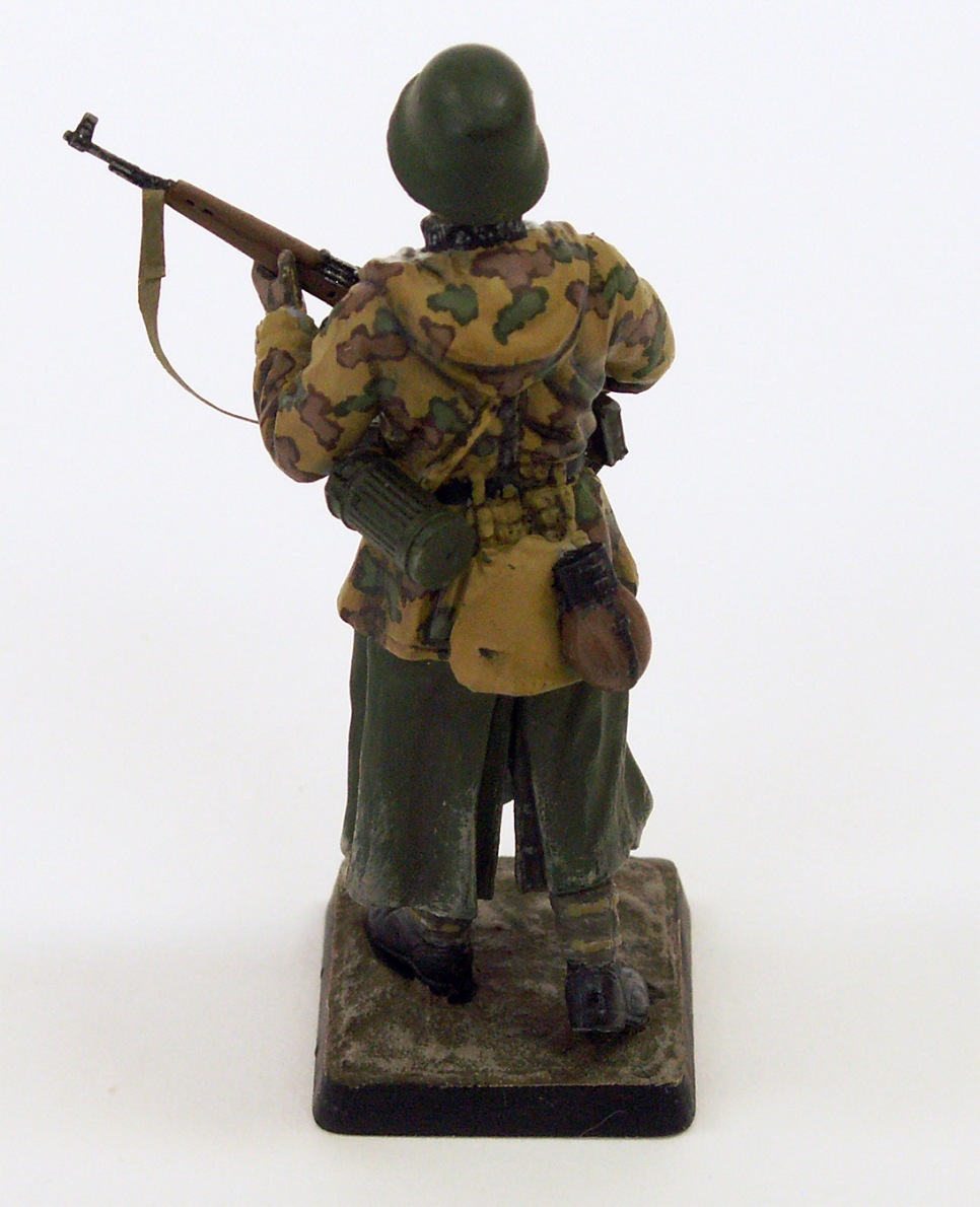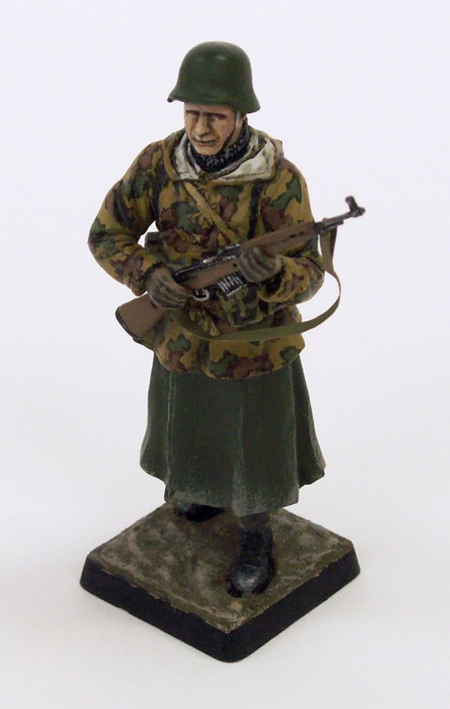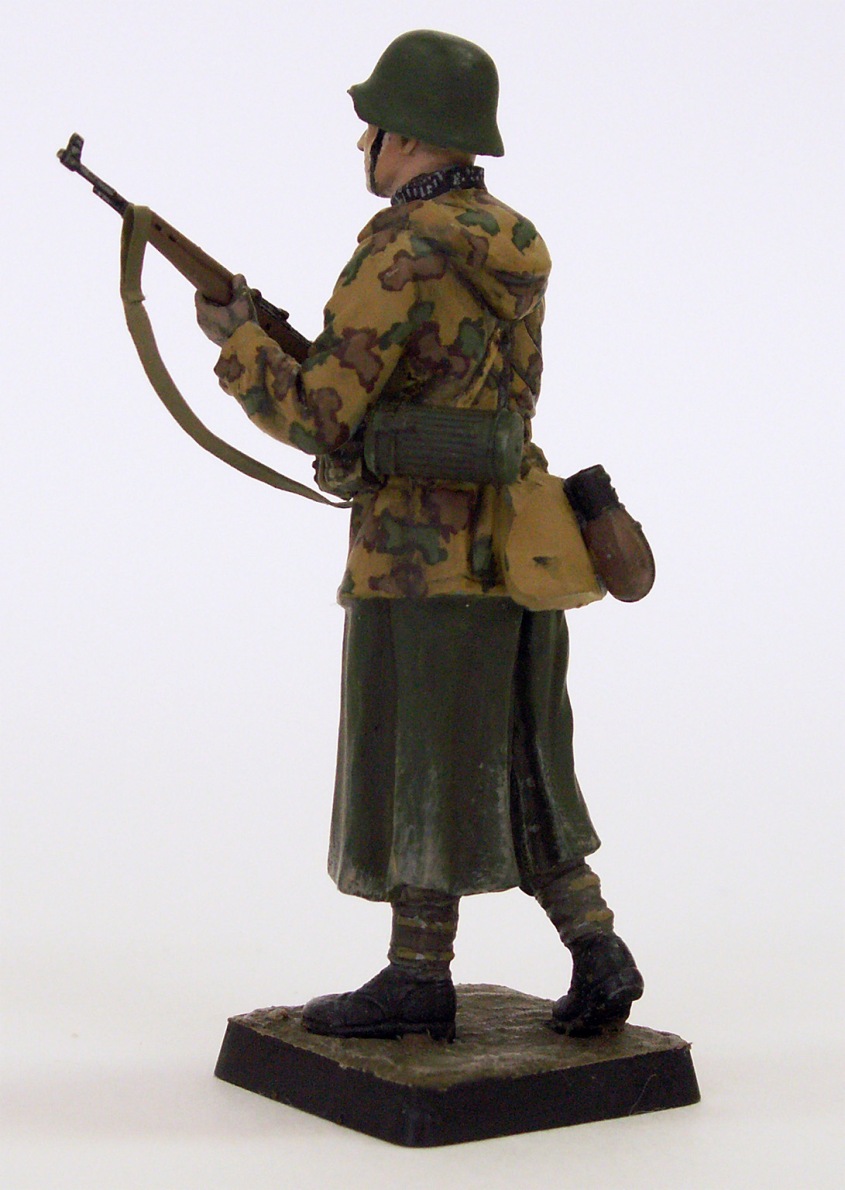 Камуфляж хороший. А вот по поводу кистей рук: у Вас немец в перчатках? Если нет, то цвет кожи не тот, скажем так-неживой. Еще можно отдельно сделать пальцы, т.е. сделать пропилы м/у фалангами, и обработать. Эффект будет реалистичней. Но для начального этапа зачет.