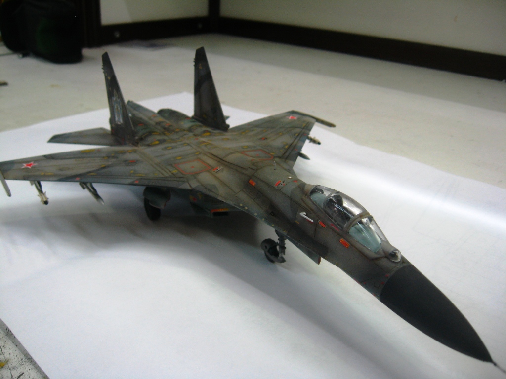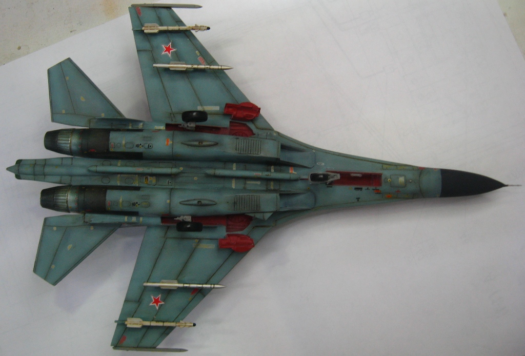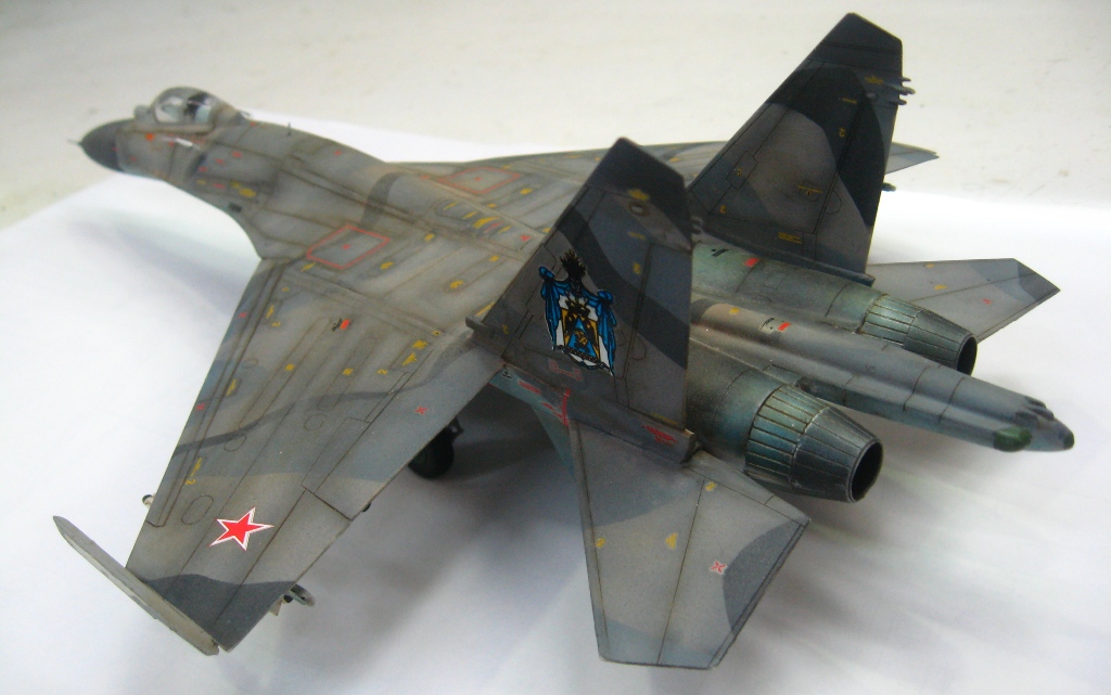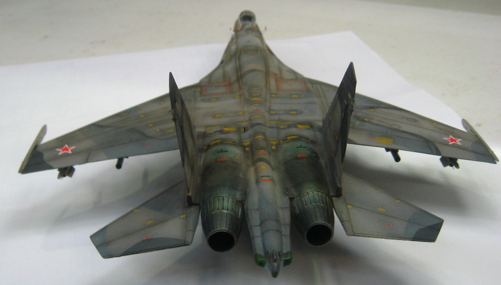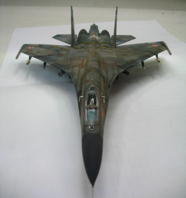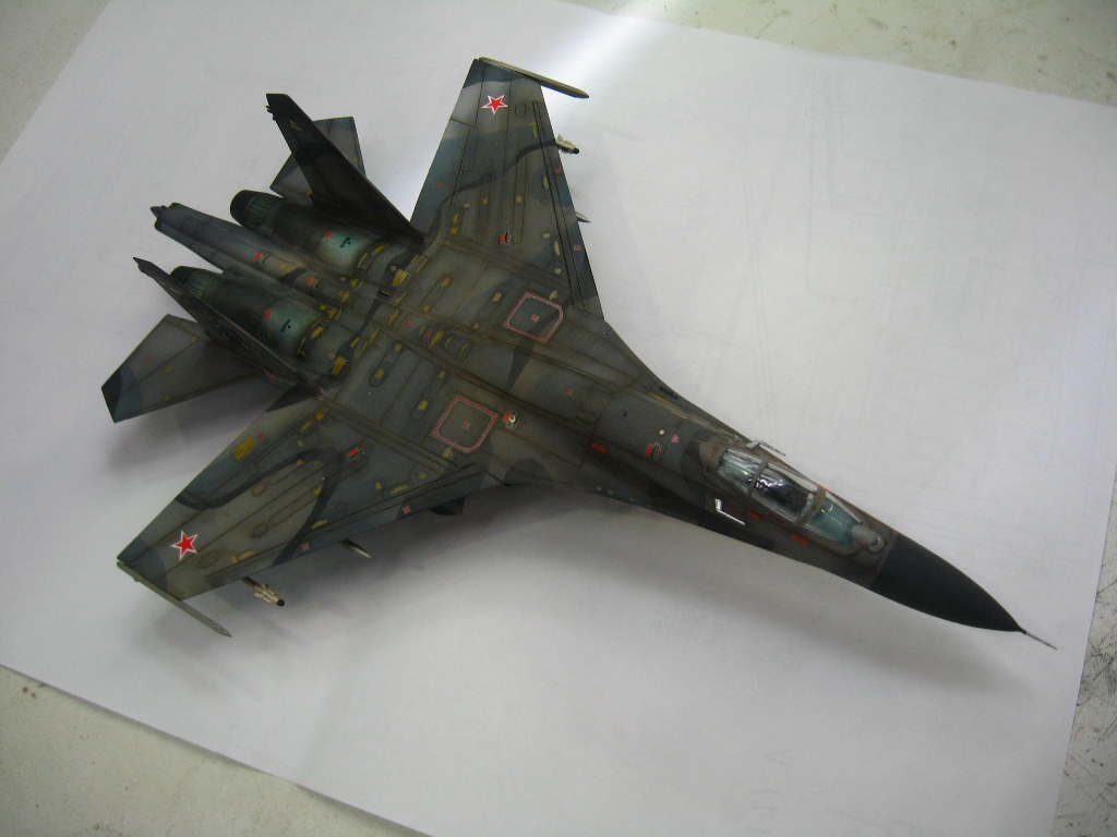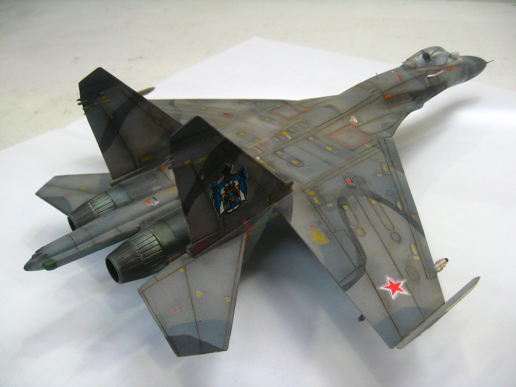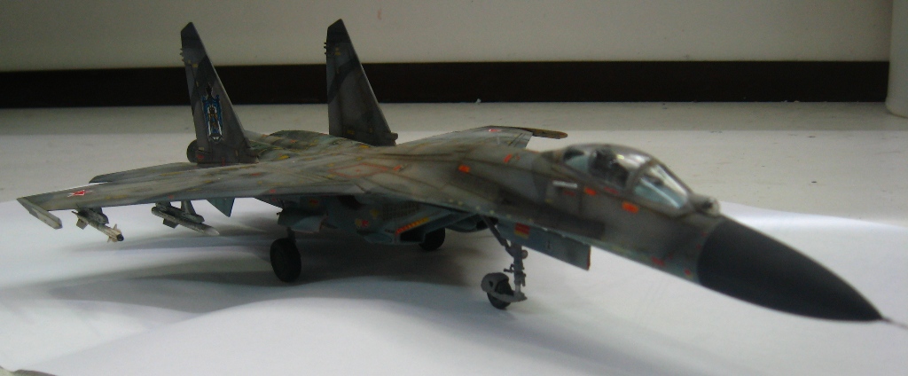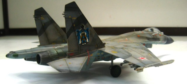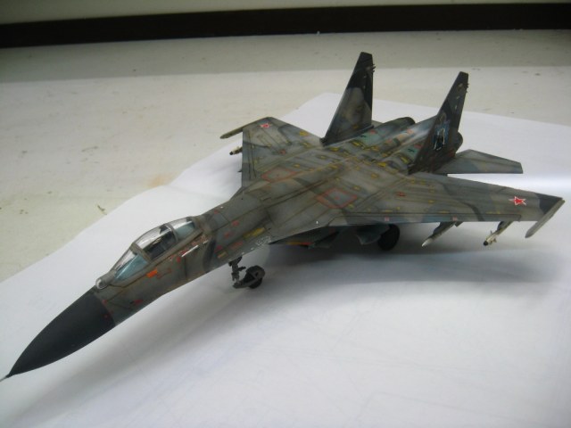 Чистая "изкоробко". Из добавлений только бегемотовская техничка. Красилось тамией, пигментировалось ей же. В качестве смывки первый раз попробывал масло на бенизине. Борт фентезийный. Камуфляж взят от одного самолета, ОЗ чистая фантазия. Техничка соответствует Су-27УБ позних серий.