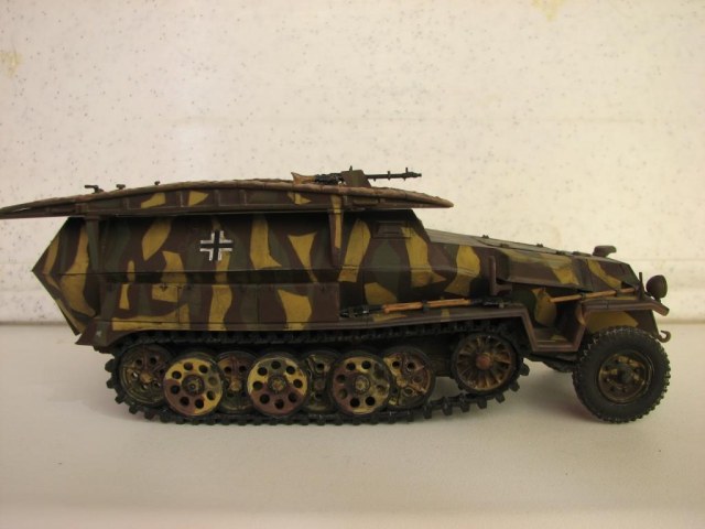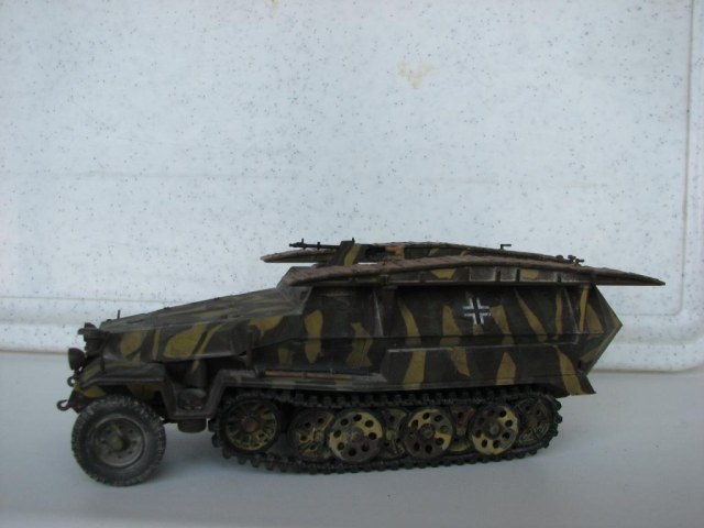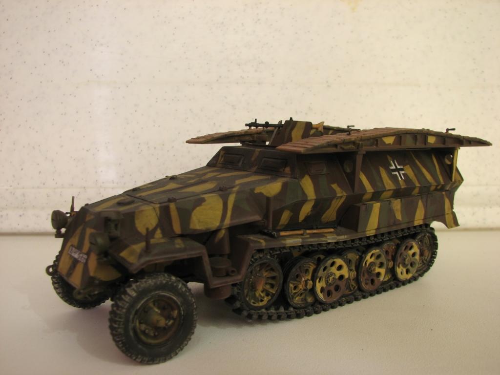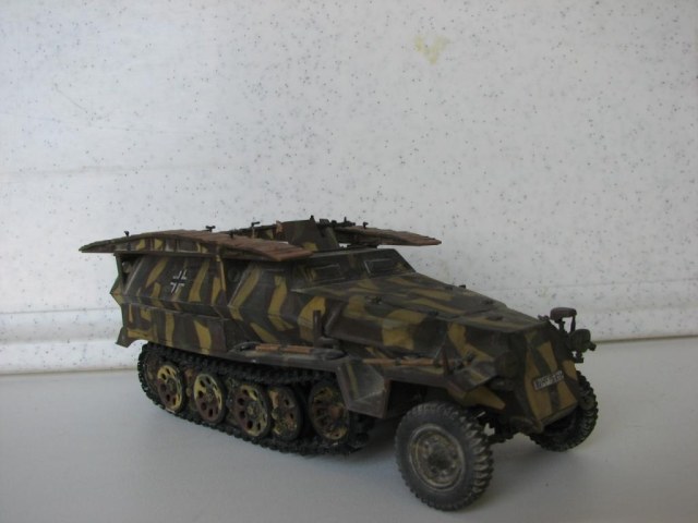 Добрый день, уважаемые коллеги! Представляю Вашему вниманию свою очередную модель. Сначала о ней самой. Первый раз работал с АФ и честно сказать слегка разочарован. Слишком мягкий на мой взгляд пластик, много следов от толкателей, вроде по мелочам, но от стыкуемости тоже хотелось бы большего (шпаклевки задействовано не мало), ну и поразило 17 литников в коробке, ну это как говорится на любителя, хотя по моему перебор, гуси не ахти, а про декали даже говорить не хочу, выкинул сразу, пришлось изыскать по старым запасам, ну а так вроде нормально... Модель полностью изкоробки. Долго мучился с окраской, т.к. не хотелось делать его банально серым. В инете нашел подобный камо http://ru.wikipedia.org/wiki/Файл:SdKfz251-7.jpg, ну что получилось судить Вам. Дальше как обычно, грунт, акрил лаки Мr.Color, фильтры MIG, тонировка АК, пигменты Валехо.