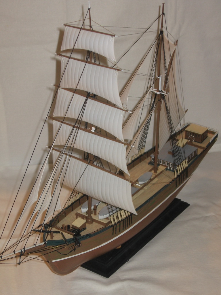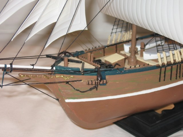 Ну, как обычно, за сборкой и покраской корпуса последовала уйма работы с палубной мелочёвкой (одни только белые рамы на окнах кают-компании чего стоят), и ещё большая уйма – с такелажем (входившие в комплект синтетические нитки постоянно расплетались, пытались выпрямиться, не завязываясь в узлы и приклеивались к пальцам, ножницам, пинцету, - чему угодно, но только не к рангоуту…) Но, в конце концов, строительство корабля было завершено, оставалось лишь дать ему название, т.к. просто "бригантина" – бездушно, у корабля должно быть имя. «New Shipyard», что означает «Новая Верфь» - в честь возобновления работ по постройке кораблей.