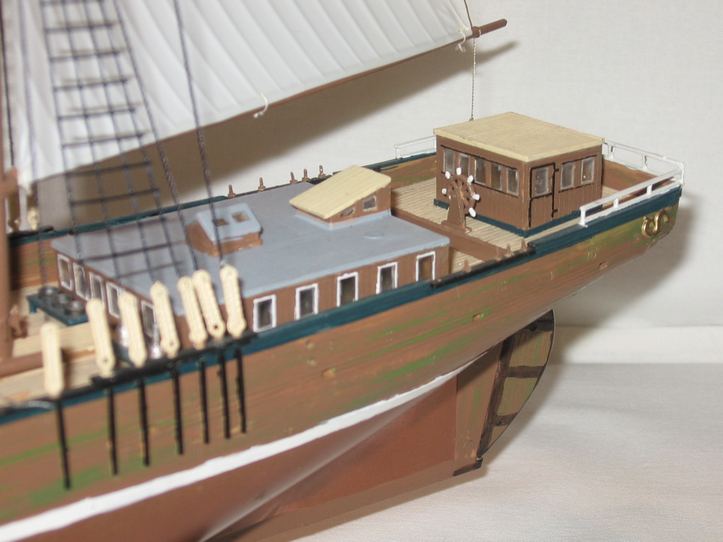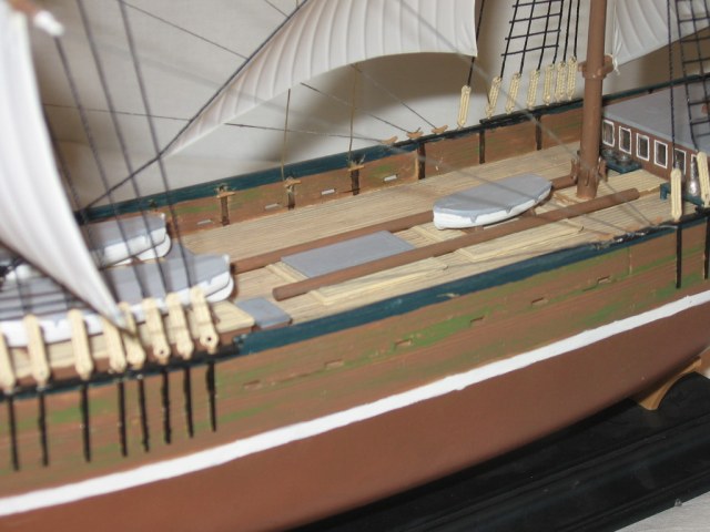 Палуба весьма неплоха... Но ей бы "смывочки черненькой", чтобы выделить стыки досок, штурвал - ф топпку!!! - этож какие ЛАДОНИ надо, чтобы его вращать :-) ну и собственно, а что он поворачивает????? Он на палубе сам по себе, а перо руля само по себе :-) Ладно, это уже "придеризмы" (хотя пару ниточек от него под палубу я бы приклеил, чтоб сымитировать штуртросы) :-)
