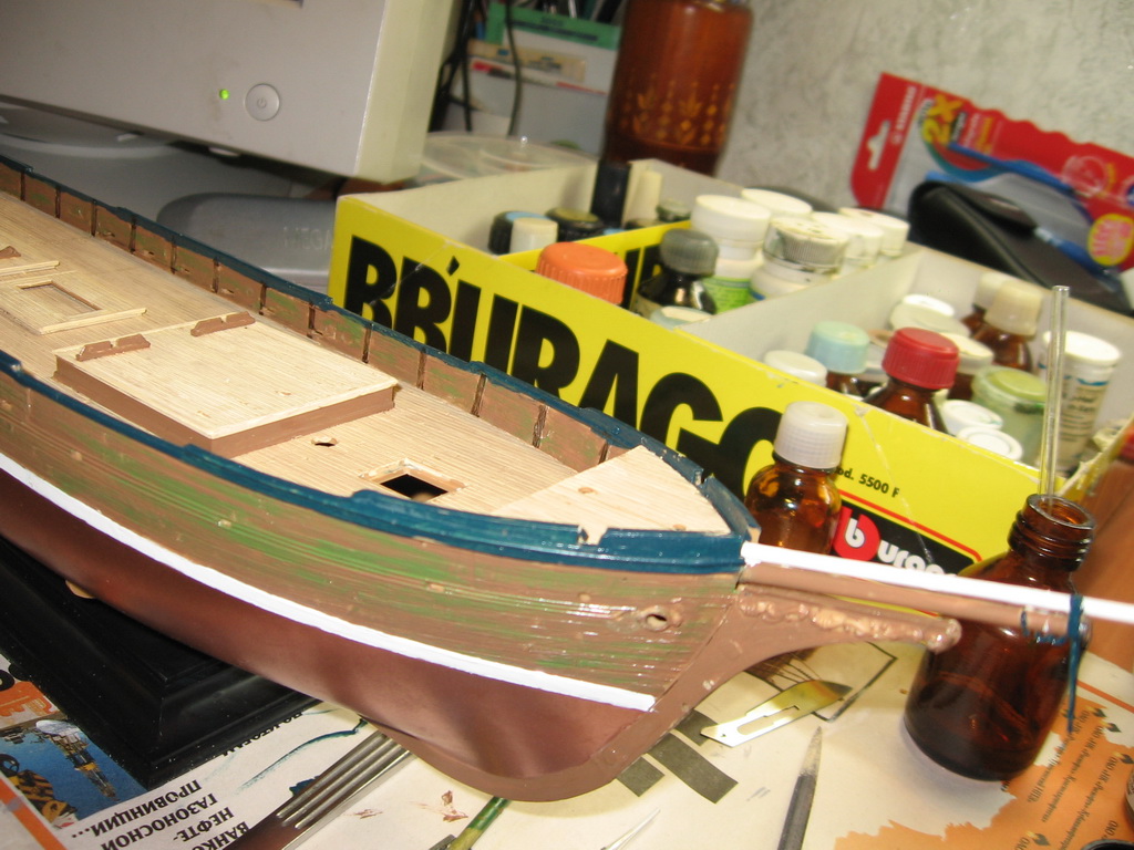 Палуба - папина работа! =) У меня так же никак не получается. %) Про смывку узнали только пару месяцев назад, придя на "Каропку", поэтому впервый опыт состоялся совсем недавно на ганзейском когге, но видно не очень. Корабль потом будет тоже выложен тут, но много позже: по плану и по очереди - шлюпка, "Саут гудвин", "Катти Сарк", "Нинья", ещё шлюпка и только потом ганзейский когг, укомплектованный ещё одной шлюпкой!