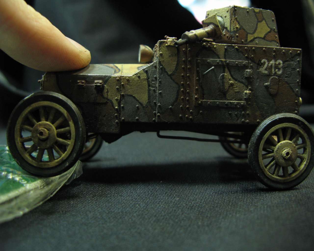 Модель помыта в кроте. Зашпаклевана. Поставлена фара от эльфа. Пересобрана подвеска (на пружинных рессорах, подвижная). Срезана полностью вся клепка, вставлена новая от мастер клаба. Кое где сделаны петли. Поставлен новый пулемет. Ручки из проволоки. Ну и всяка разна мелочь. Сторался соблюсти матчасть, но люди знающие найдут недочеты...