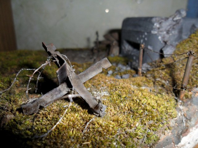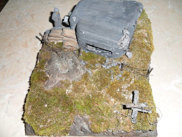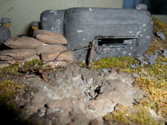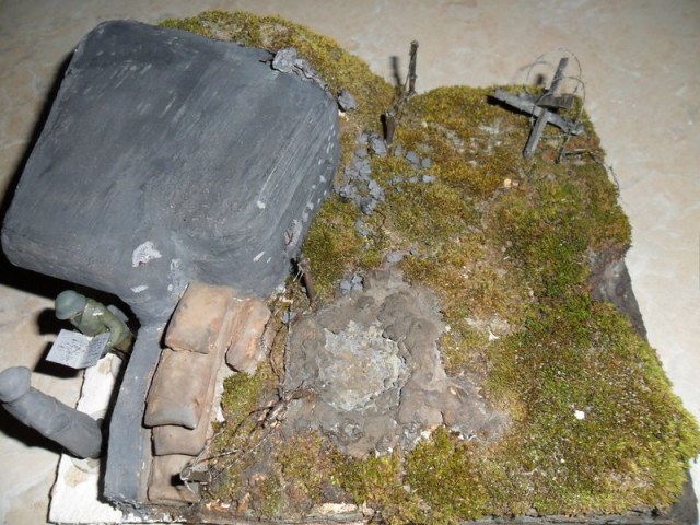да я в курсе. что и где должно находиться(к примеру: должно быть несколько рядов ежей и колючки),если всё очень масштабно делать то диорама может получиться очень уж большая;такая и на полку не поместится,поэтому всё по минимуму и кучно .