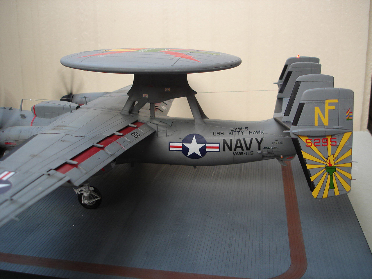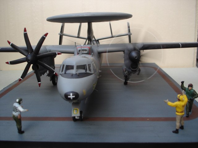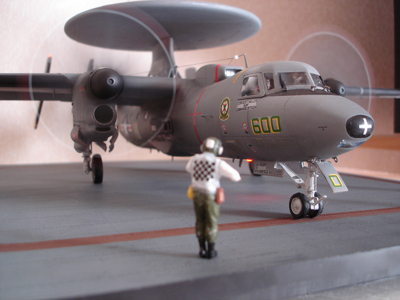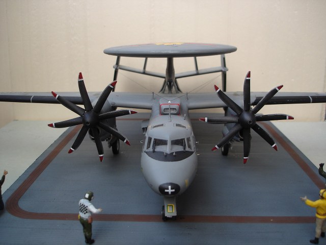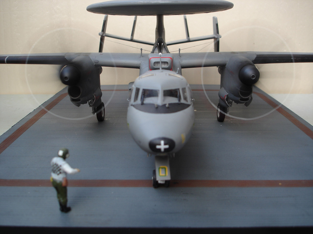 Представляю Вам свое очередное произведение от Italeri, E-2C Hawkeye, самолет палубник ДРЛО.Масштаб 1:48. Сборка неплохая, хотя без шпаклевки не обошлось. Красил акрилом Tamiya. аэром. Сверху задута матовым лаком тамиевским.Пилоты от Хаси, кабина изкоробочная, когда нашел травло, было поздно, ну не ломать же. Досадно, но ладно. Из небольших доработок : двигатели запускаются, раздельно, БАНО, маяки, фары, тормозные шланги, по 2 на стойку проходят через 2 хомута. Питания из вне нету, все внутри самолета. 5 таблеток 3-х вольтовых работают на 3 МВ, освещение все соответственно на диодах. В носу самолета гайки и болты для утяжеления и в при этом он все равно покачивается, так что прищлось передние колеса немного прихватить клеем. Подставка Eduard под палубу авианосца ( судя по покрытию это место стоянки). Задута акрилом и выделено место стоянки.Самолет получился тяжелым, шасси стали подкашиваться, пришлось просверлить вдоль стойки и просунул штырь металлический. Антенны натяжные леска, на плоскостях стоят также штыри, т.к. родные не выдержали натяга. В приемниках давлений просверлены отверстия и добавлен слева датчик углов атаки. Фигурки поставлены для порядку, так что не знаю даже куда ее вставлять, в диораму или в авиацию. Некоторые фотки сделаны при комнатном освещении чтобы выделить огни. Так что строго не судите, жду Ваших коментов.