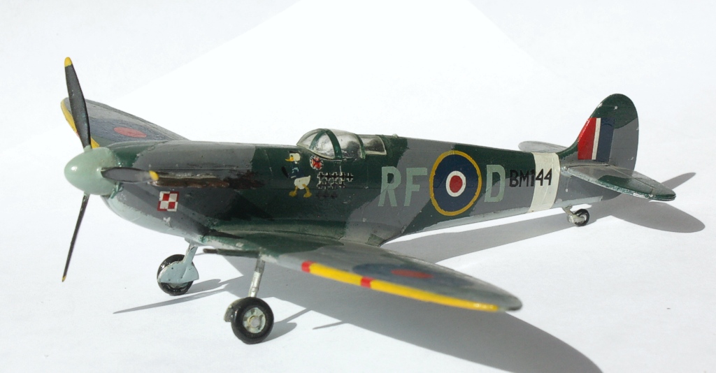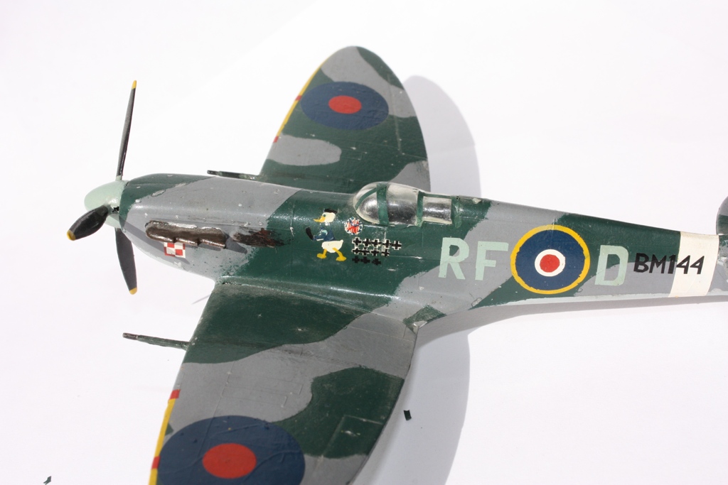 Модель НОВОвского Спитфайра, выпускавшегося в Донецке. Собирал её почти 30 лет назад, по моему в 1982 году. Одновременно с ранее выставленным Тандерболтом. Сам набор похоже сделан в начале 60-х годов. Косяков в нём столько, что и не перечислить – одно сверхтонкое крыло чего стоит. На этой же модели я тогда поставил задачу отработать окраску и главное – технологию изготовления самодельных декалей. Так что просто собрал (добавил только пушки, изначально модель было модификации Mk.IA) и принялся за окраску (вариант окраски взят из польского журнала).