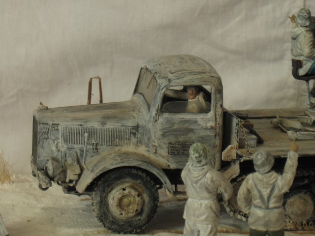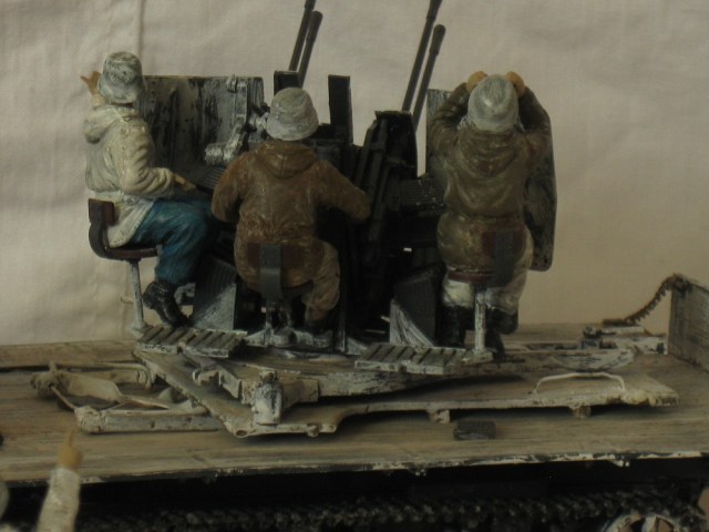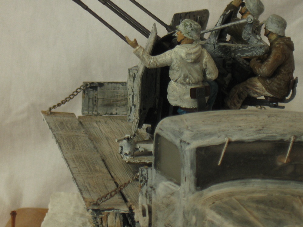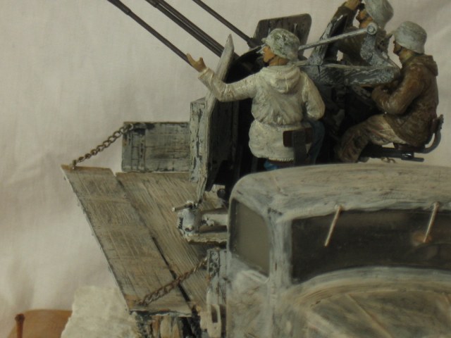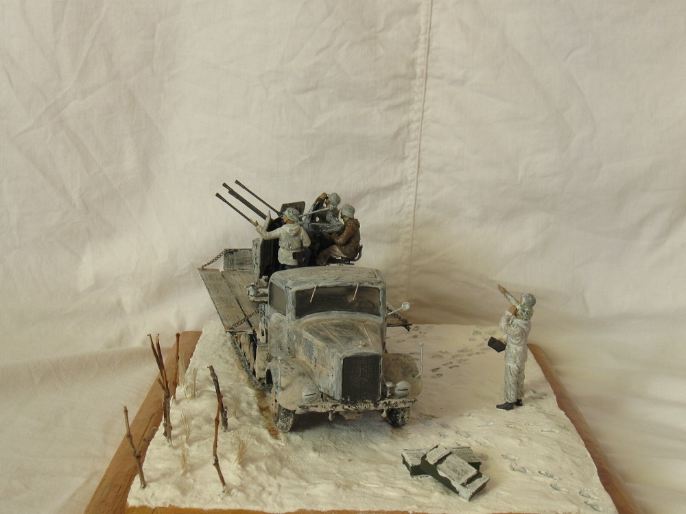 Думаю история применения маультира и качество его уменьшенной копии известна всем, или по крайней мере многим, так что в эти подробности я вдаваться не буду, а расскажу лучше об адаптации грузовика в зенитку. Первое, что пришлось делать, поддон под саму зенитку (без него стрельба разобьёт грузовик в пух и прах) . Купить его можно, но цена 800р в интернет магазине западного происхождения мне оптимизма не прибавила, так что пришлось делать самому по чертежам и фотографиям. Далее было нужно подрезать передние опорные стойки лафета четырёхстволки, иначе её туда попросту не поставить. Вот собственно и всё. Солдат, в кабине из набора с грузовиком, был доработан для условий зимы и покрашен маслом. Машина крашена тамиевским акрилом. Серый, как основа и белый, как извёстка. Снег- сода и пва.