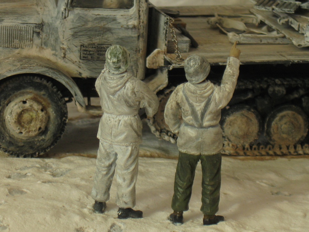 Стыки на крыше кабины не мешало бы прошпаклевать... Отсутствуют "третьи" застежки боковин капота.Грязные следы при чистейших, припорошенных снегом, колесах и гусеницах? Гусеницы звезда дает уже с провисом, а у вас они как винил "парят" без всяких провисов, с левой стороны на ленивце "складка", а с правой, сверху по середине - разрыв. На некоторых фото, значек на пробке радиатора есть, на некоторых - нету, отломали во время фотосессии?
