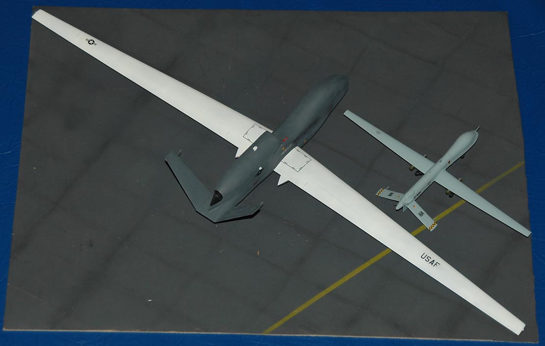 Ну что сказать про модель... много времени и сил отняла кабина.... Ту-16, по этому решил собрать чего нибудь беспилотного. Пошел в магазин, купил Предатора и Глобалхаука, собрал из за два выходных и с удовольствием поставил на полку))), кстати, для сравнения габаритов этих машин я сделал пару кадров, где они рядом.