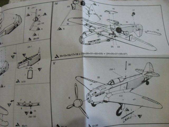 Итак, коробка, открывающаяся сбоку. На лицевой стороне - рисунок самолета, на обороте - схема покраски под зимний вариант (в двух словах: "Крась белым"). Открываю коробку и извлекаю на свет пакетик с детальками и бумажками. Все в общей упаковке и по размеру раза в 2 меньше коробки, благодаря чему в ней свободно перекатывается. Посему вполне может сломаться. В наборе инструкция гармошкой (русского языка не предусмотрено, но школьных навыков английского для чтения вполне хватает), печать не очень четкая, но читаемая. Декаль на один вариант, без всякой технички. Детали же предусматривают сборку как Як-1, так и модификации Як-1М.