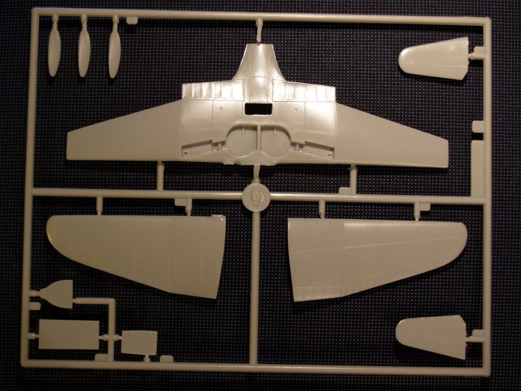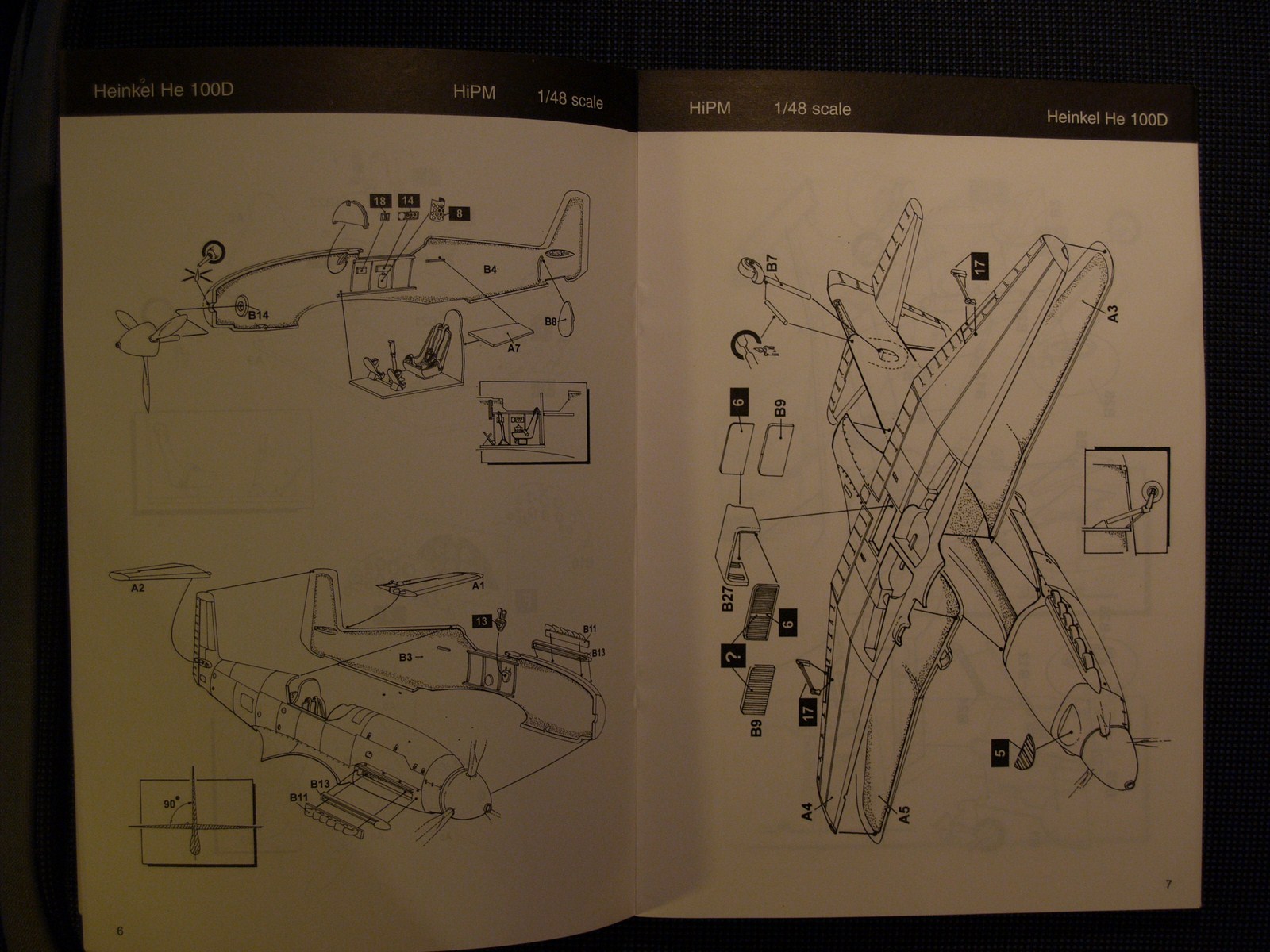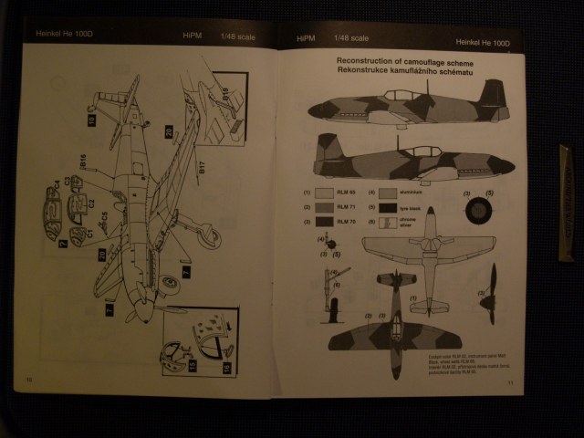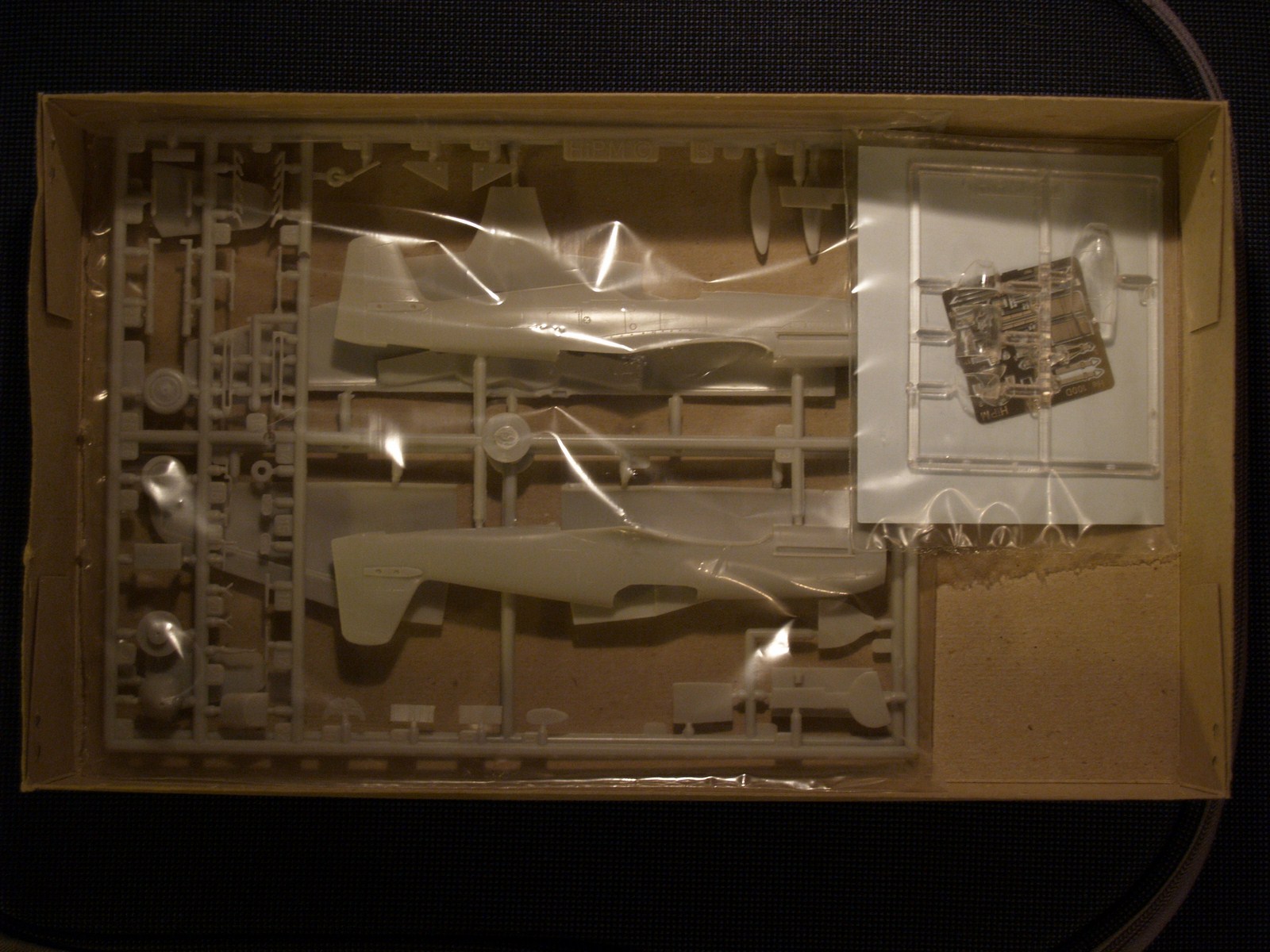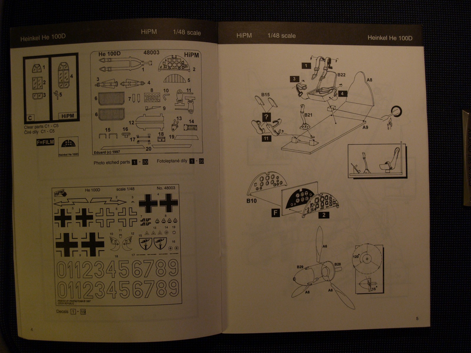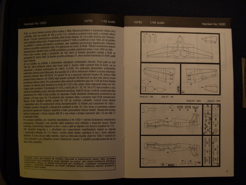 Теперь, собственно, о самом наборе. Все содержимое аккуратно упаковано в коробку 32х19 см стандартного картона с цветным открывающимся верхом и обычным, бумажного цвета низом. Внутри два запаянных пакета: в одном два литника светло серого оттенка с деталями самого агрегата, в другом, поменьше, прозрачный литник с двумя вариантами фонаря (цельный и на открытый вариант из трех частей), декалью на Бог знает сколько вариантов (но не на один, точно) и плашкой фототравления от Эдуарда, на которой тесно соседствуют привязные ремни, решетки воздухозаборников, приборка, педали, внутренние ручки сдвигания фонаря (!) и еще какая то мелочь. Собирать всю эту красоту предлагается при помощи маленькой книжицы, с кратким описанием прототипа на английском и чешском языках и вполне информативной инструкцией по сборке.