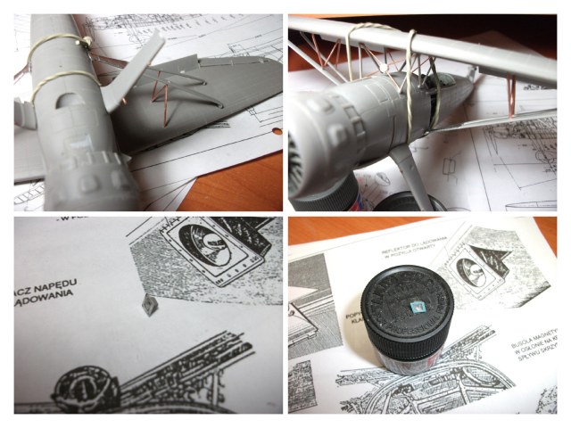 несколько слов о наборе... пластик добротный и мягкий, обработке поддается хорошо... расшивка тонкая и не глубокая (местами пришлось дорезать недостающюю)... стыкуемость, в основном, неплохая... затруднения вызвала только установка двигателя и крыльев через подпорки к фюзеляжу...