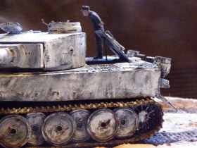 неплохая диорамка, к тому-же сюжет очень частый для немецких танков в период зимы. по модели скажу, что выполнено достаточно аккуратно, но как то окрас больше похож на мрамор что ли) а в целом очень не плохо!