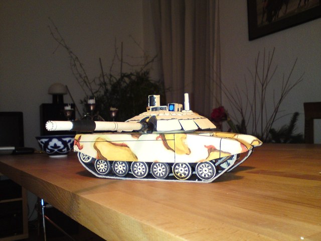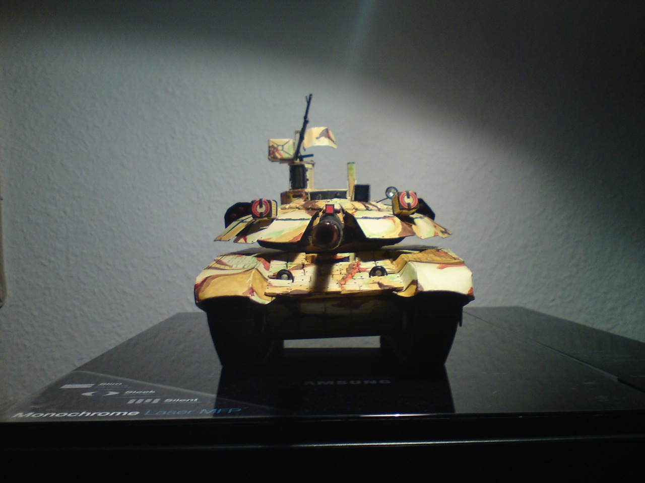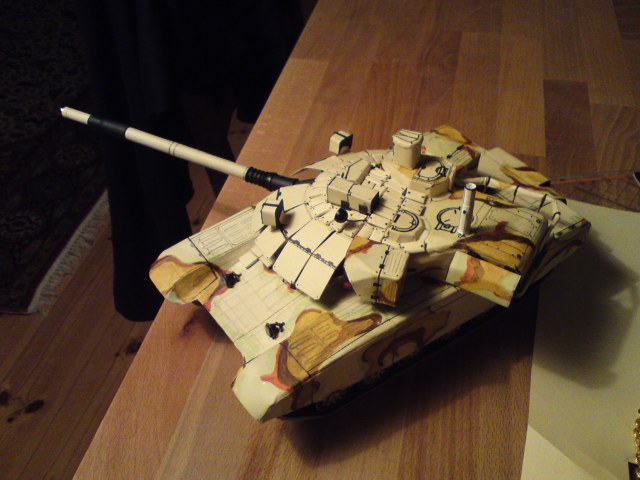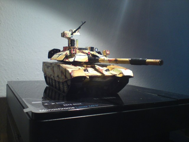 Ну у меня вообще нет слов. Не танк, а сборная солянка на постСССРовском пространстве. )))Корпус, катки, башня - от 72-ки; фальшборта передние и бортовые, гусеничная лента - от 80-ки; двигатель вообще от дизельной 80-ки или от 64-ки поздних выпусков. Про пушку, динамическую броню башни и автомат заряжания я молчу, это всё новьё. Автор - молодец!!!