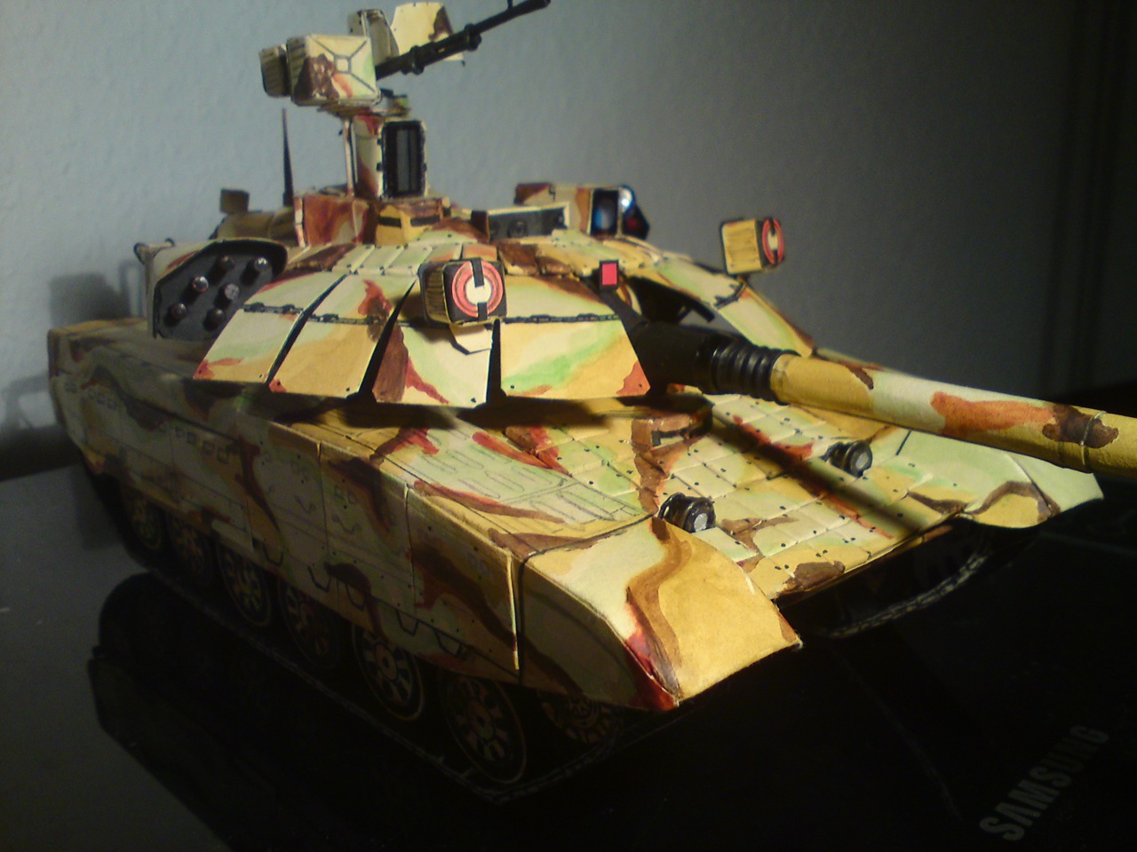 Представляю вашему вниманию модель танка Т-72-120 Харьковского изделия . Танк сделан исключительно из картона(из под обуви), Башня имеет НДЗ, противокумулятивные экраны,борта прикрывают резино-металические экраны. Вооружение 120мм пушка со спаренным пулемётом калибра 7,62,а на крыше башни имеется дистанционный пулемёт Утёс, Модель сделана из картона, пушка из обычной ручки,пулемёт из дерева.Динамическая защита на лобовой броне и на башне тоже из картона срезаны на мелкие кусочки и ещё раз приклеены цветной бумагой.Осветительные фары сделал из кончиков колпачка ручек,использовал прутья чтоб их зафиксировать на броне. Делал ету модель смотря на фотку из инета,она мне так понравилась решил её сделать. Надеюсь он вам хоть чуть понравитса,спасибо за внимание