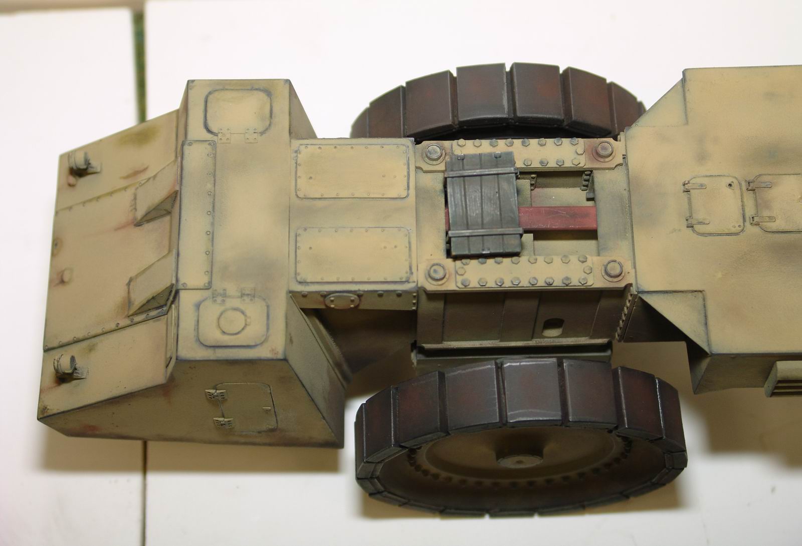 Выношу на обсуждение модель тяжелого минного трала Krupp Raumer-S. Машина была построена фирмой Крумм для проделывания широких проходов в минных полях. Машина имела серьезное бронирование, два танковых двигателя Майбах, разнесенные по ширине колеса, что позволяло делать достаточно широкую полосу разминирования. Вес 130 тонн.