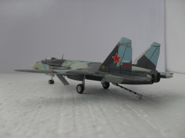 Серийный экземпляр легендарного самолета Су-47 «Беркут», входящий в состав не менее легендарной 13-й эскадрильи ВМФ РФ «Счастливая подкова». Борт майора Петра Зарницкого, одного из асов «Счастливой подковы», имеющий усиленное бронирование, что позволило ему наносить удары по наземным целям a’la штурмовик, не особо опасаясь ответного огня с земли. Боевое крещение получил во время Второго Кавказского конфликта, когда пара Чернметов – Зарницкий встретилась с парой Raptor’ов ВВС Грузии. Противника удалось втянуть в пушечный бой, и меньше чем через две минуты счет был 2:0 в нашу пользу. В бою новый «оскольчатый» камуфляж настолько эффективно зрительно смазывал очертания самолетов, что пилоты противника не смогли даже разглядеть знаменитые беркутские крылья обратной стреловидности и, соответственно, понять: что же их сбило. «Беркуты» 13-й эскадрильи также часто использовались в качестве летающих командных пунктов, благодаря способности трех РЛС «видеть» все пространство вокруг самолета без мертвых зон. Также успешно себя показывала себя и новая система постановки радиолокационных помех «Туман».