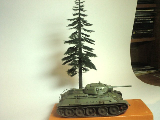 Вершинка ели сплетена из проволоки и посажена в заранее заготовленную заготовку будущей большой ели.Сам ствол сделан из дерева (бук).Для удобства последующего монтажа в стволе просверлены отверстия для веток.Для имитации коры, я ствол обмазал клеем ПВА и посыпал мелкими древесными опилками,которые также были заготовлены заранее.Техника кора из опилок была подсмотрена сначала на сайте Диорама.ру ,а затем в журнале "М-Хобби". №2 (119) 2011.Основной ствол задул сначала Тамиеё XF-79.Затем слегка задул XF-51 и совсем немного сверху по всему стволу прошёлся XF-49.Хвоя задута XF-13.