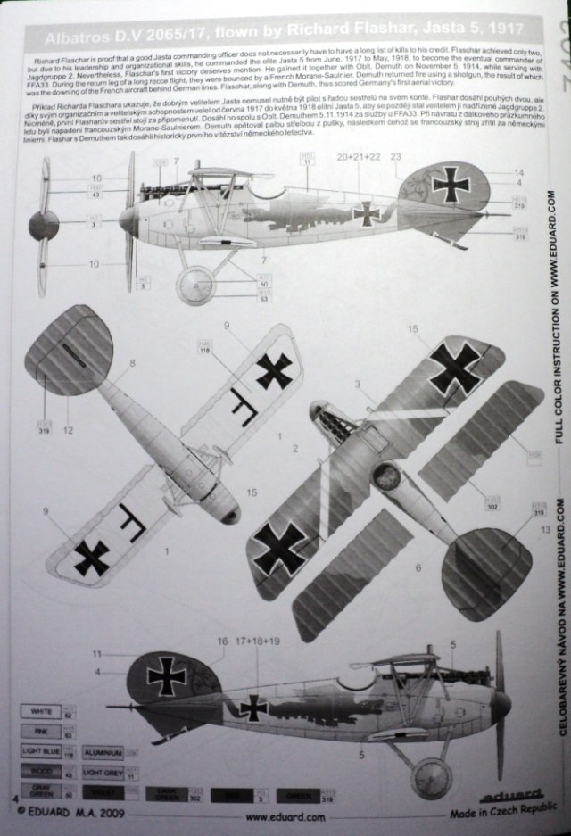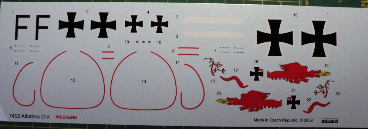Почему? Да потому что это Альбатрос командира пятого ягдштаффеля Рихарда Флашара, который сбил всего один самолёт, зато свою машину раскрасил так, что она была одной из самых ярких на фронте. Вы посмотрите только – крылья окрашены в ярко-зелёный с сиреневым с полосами на верхнем крыле. Хвост зелёный, а на серебристом фюзеляже нарисован восьминогий дракончик с длиннющим хвостом. Очень яркая штука! Впрочем, Роден предлагает декаль с 6-ю видами окраски, среди них фон Рихтхоффен, Альтхаус, Геринг... Разнообразно, но зато не так интересно. Будем считать, что и тут ничья.