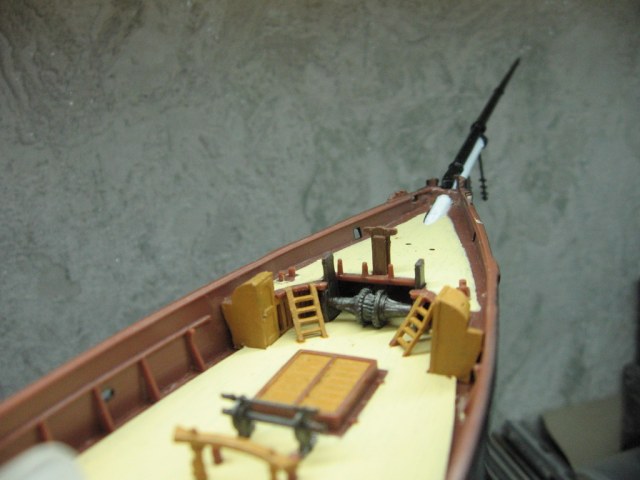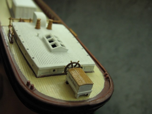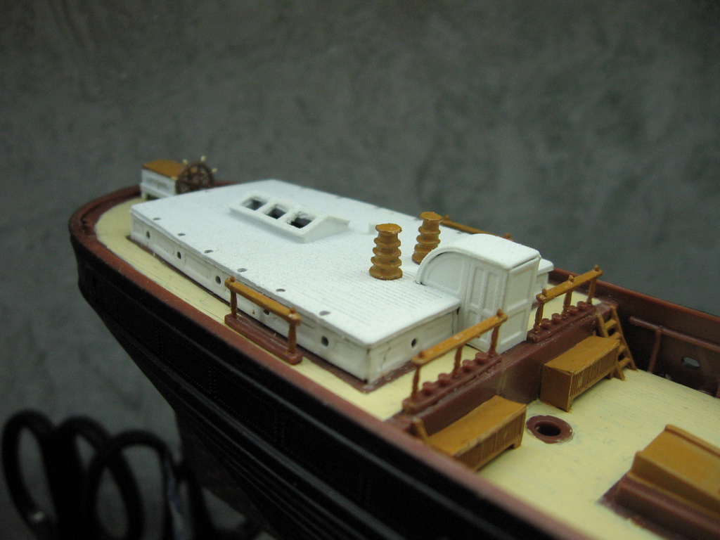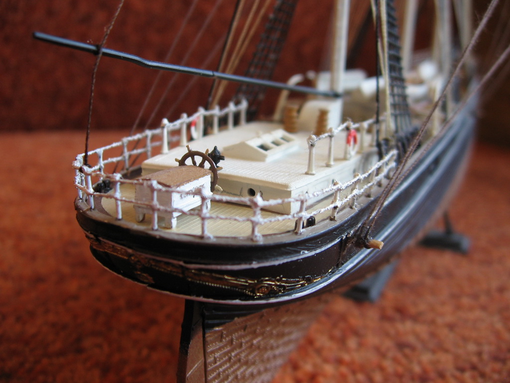 Далее были сплетены остальные снасти бегучего такелажа с повторным креплением опадающих, словно осенние листья, реев – да-да, опять и снова! Хитом стала треснувшая фор-брам-стеньга с реем, повисшая на нитках. После "паутинных" работ, кои являют весьма упрощённый вариант оригинала, оставалось подкрасить всякую мелочёвку: места крепления лисель-спиртов в выпущенном положении, недомазанные части палубных построек, якоря, затёршуюся ватерлинию и потускневшую позолоту. Да изначально позолоченной по ошибке и "по привычке" носовой фигуре был возвращён оригинальный белый цвет.