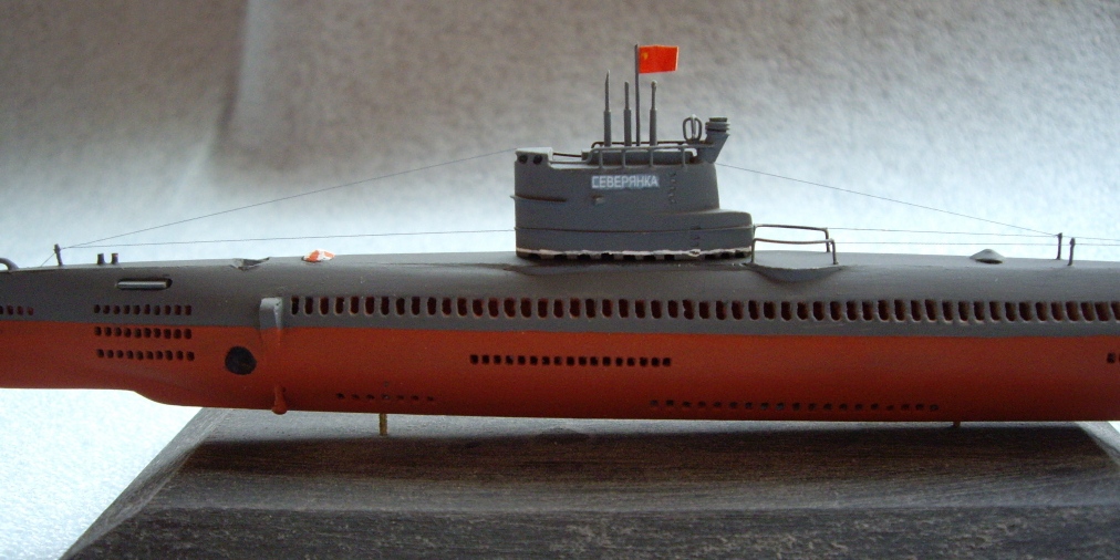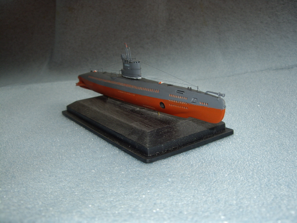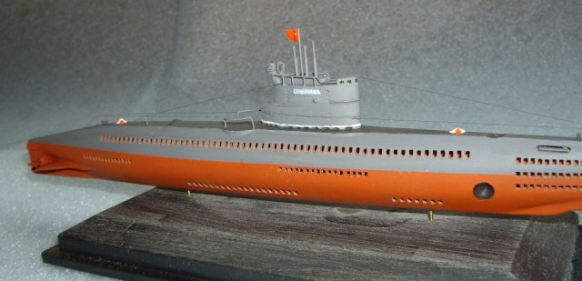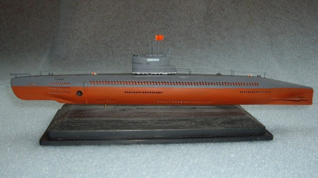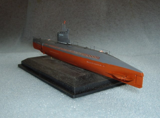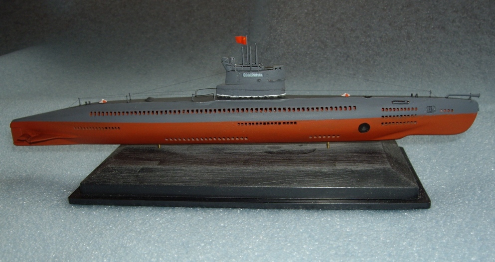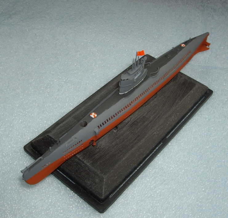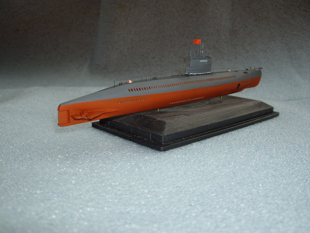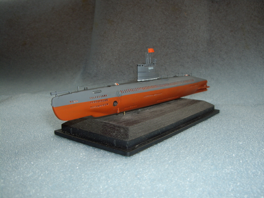Подумалось, что в то время не было красок типа металик, покрасил корпус базальтом от Валехо. Палуба - Акановская старая резина. О цвете подводной части ничего не нашёл и покрасил по базовой схеме 613 –го проекта - оранжевым от Звезды.