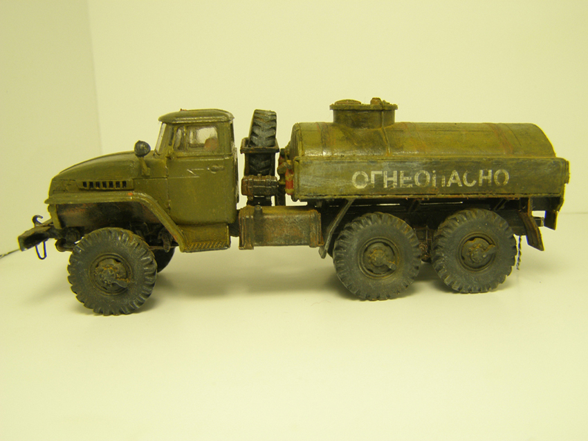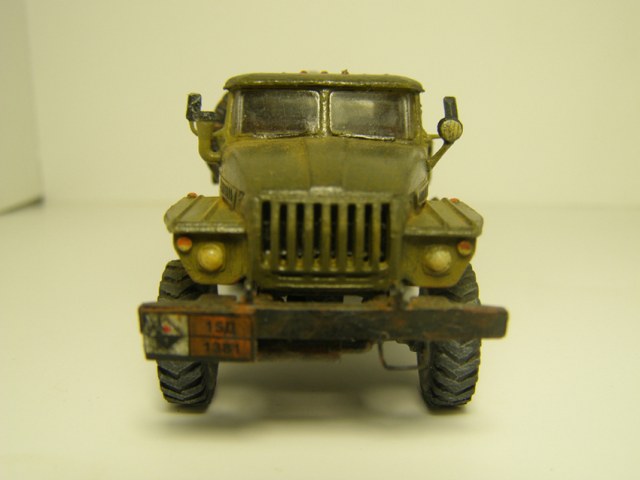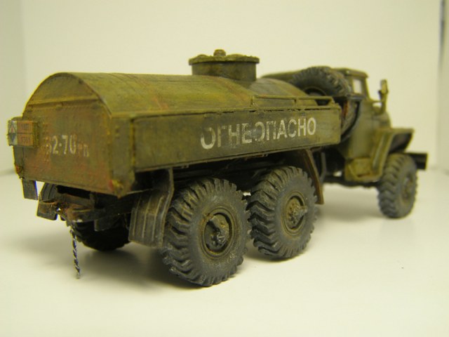 В этой части я согрешил больше всего раз.Это и покраска с уже вставленными стёклами, и отсутствие грунта.Что нащёт потёков на баке,читал я про это,и говорят что их нет,потому-что Уралы принадлежащие ВВС тчательно моют.Оправдыватся мне безполезно,что мол это не обязательно,ведь с такими номерами она могла быть и на гражданке.Но всёже я очень хотел изобразить эти потёки,уж извините.