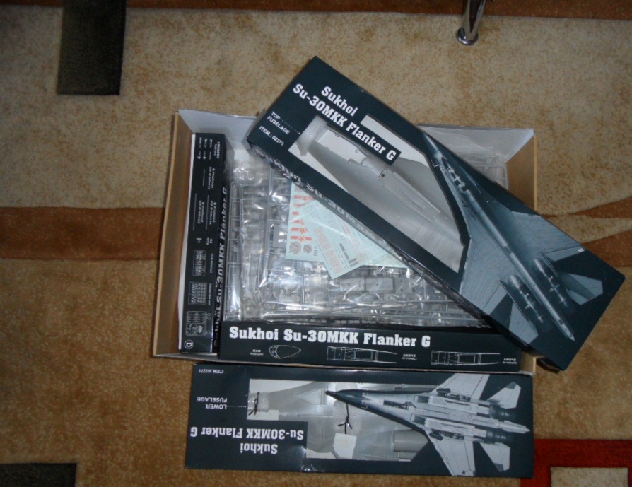 Всем привет! Вот решил написать обзор на очень интересную модель- су 30 мкк от трумпа в 32 масштабе. Я хоть и собираю 72 , но удержатся и не купить этого красавца не смог. Коробка огромная , причем по высоте- мне пришла порванной и изрядно помятой- вот тебе и ЕМС почта, я ожидал худшего , что при таких вмятинах что нибудь отвалилось или сломалось, но спасибо товарищам из трумпа все детали выдержали благодаря продуманнойц упаковке. Две половины фюзеляжа упакованы в отдельные коробки, конус, пневматики стекла , стойки шасси из металла, воздухозаборники тоже лежат в отдельных коробках. Расписывать я не буду- в инете есть подробные обзоры, но малость напишу. ПЛЮСЫ- отличная расшивка, клеп, никаких утяжин , облоя и замыленности- на том же ту 160 она имела место, две половинки фюзеляжа идеально стыкуются, неплохие сопла- барадавки шкурить ), и аирес не нужен , подробнейшая инструкция. МИНУСЫ- на фонаре посредине имеется шов , придется потратить время чтоб его убрать, смещение прессформ на конусе( после амодела это ерунда), ужасный ПВД- сделать лучше самому,в принципе и все остальное вылезет при сборке. Про геометрию непишу, мне она неважна. В декалях от бегемота тоже не вижу смысла- родные вполне хороши. Для себя решил собрать с небольшими переделками, но полность делать проводку на стойках и нишах шасси- хотя... аппетит приходит во время еды. Неудержался и собрал на скотч- чтож размер имеет значение рядом су 30 в 72 масштабе, модель впечатляет деталировкой и размерами.