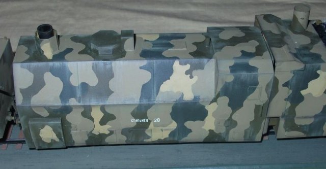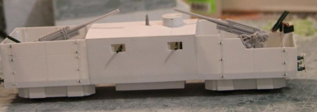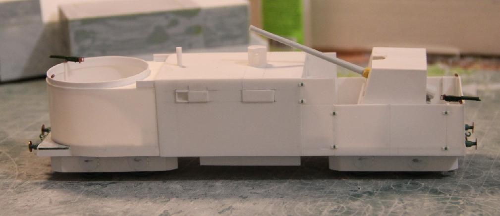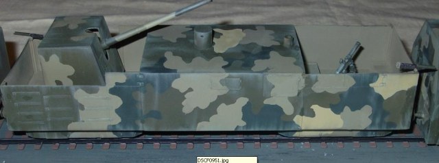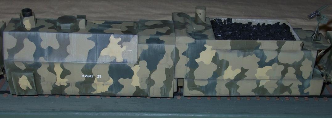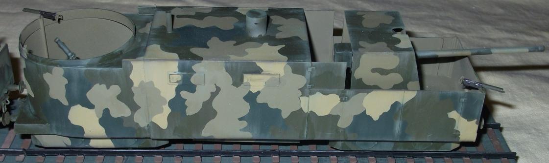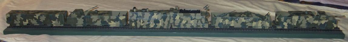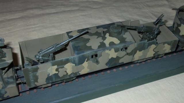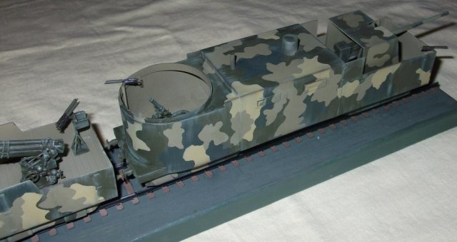 Технология изготовления все та же. Поскольку ходовая часть закрыта бронировкой каждая платформа компоновалась из 2х двухосных платформ от UM (в том числе и зенитных со счетверенкой максимов, максимы тоже пригодились). Корпуса полистирол и профили Эвергрин. Паровоз перепилен из паровоза UM. Зенитки – АСЕ, 100 мм пушки – перепил из 100 мм противотанковой пушки от АСЕ (кстати она и была создана на базе морской ), минометы – Звезда, пулеметы – от платформ UM и профили Эвергрин.