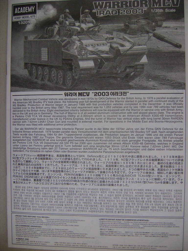 Свершилось!!!!! Наконец таки приобрел этот долгожданный кит!!!! И так как на каробке про него ничего нет - решил сделать обзор. И так модель от Академии, качество, наверное, известно всем: облоя нет, утяжин тоже, стыкуемость отличная – в общем, минимум подготовительных работ перед окраской, гусянка виниловая. Производитель дает приличный кусок сетки для имитации на забашенной корзине и кусочек шелковой нитки для троса. Еще в наборе присутствует множество канистр, ящиков ЗИП и элементов нехитрого скарба экипажа. Инструкция в духе Академии - ни слова по-русски, но зато понятна и информативна. Два варианта окраски и декалей: иракский и боснийский вариант. Очень жаль, что нутрянку не дают (видимо, она особо секретная =) раз уж британцы до сих пор не оглашают толщину брони). В общем, модель классная, для всех поклонников иностранной БТТ советую - не разочаруетесь!!!!